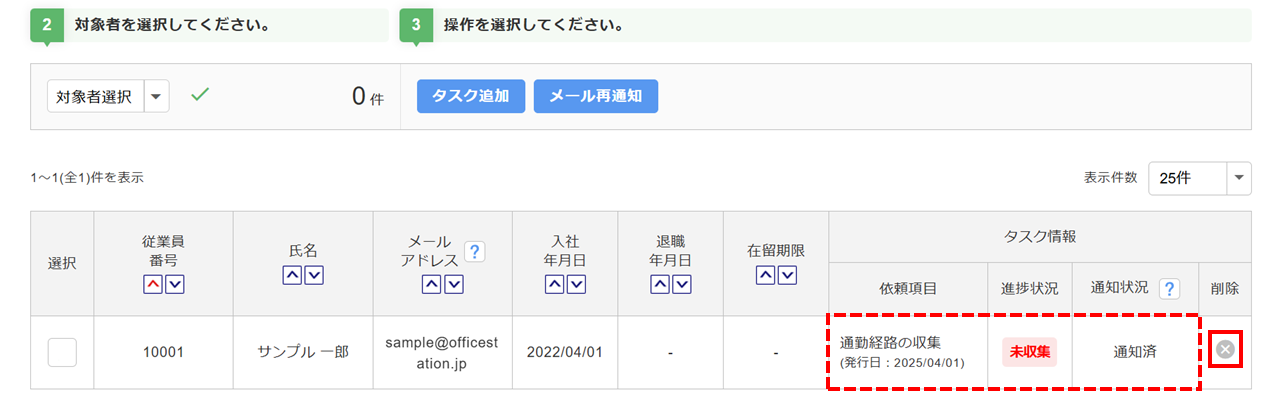 タスクの発行後、「タスク情報」列に追加したタスクの種類および状況が表示されます。