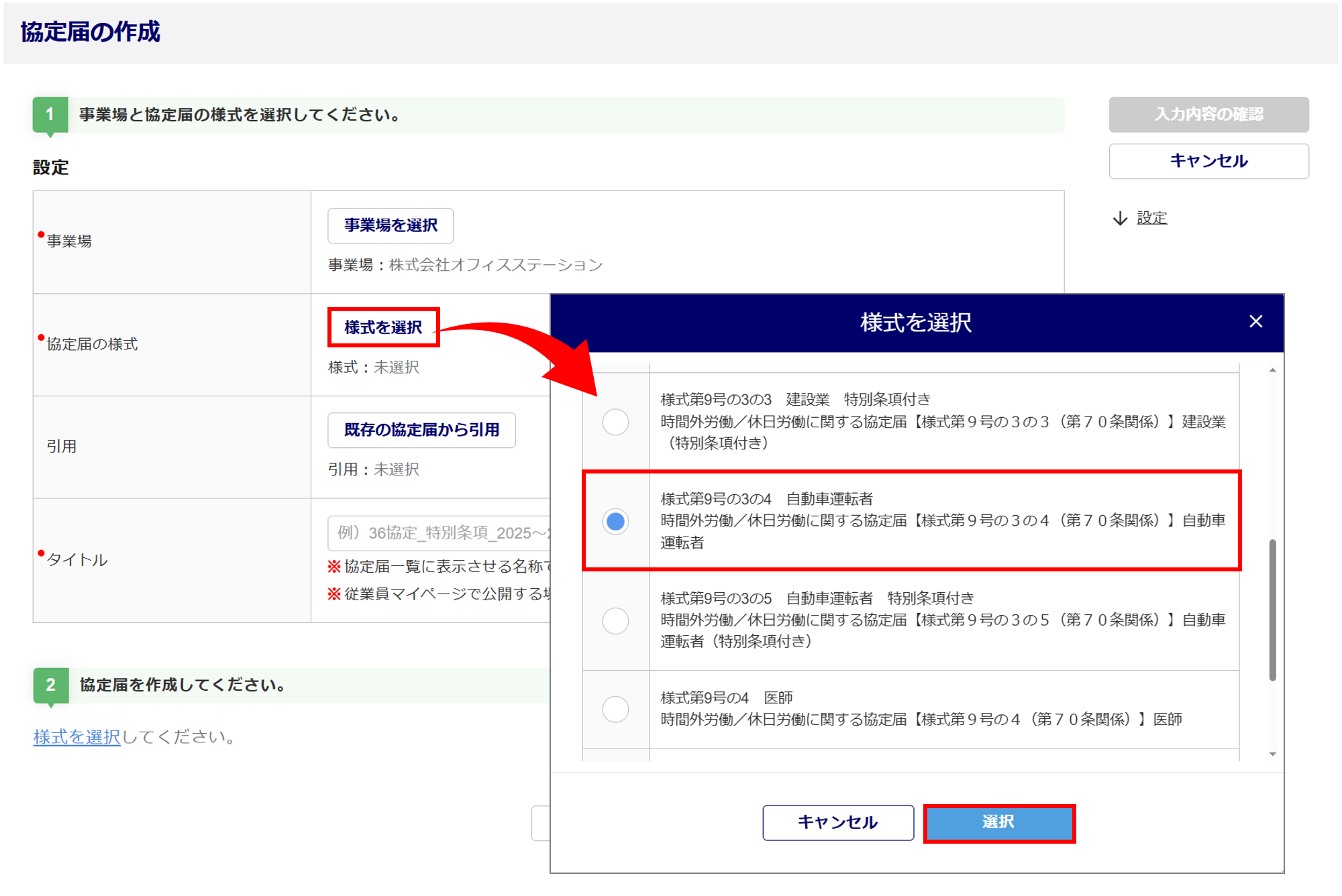 [様式を選択]から「様式第9号の3の4 自動車運転者 時間外労働/休日労働に関する協定届【様式第9号の3の4(第70条関係)】自動車運転者」を選択後、[選択]をクリックします。