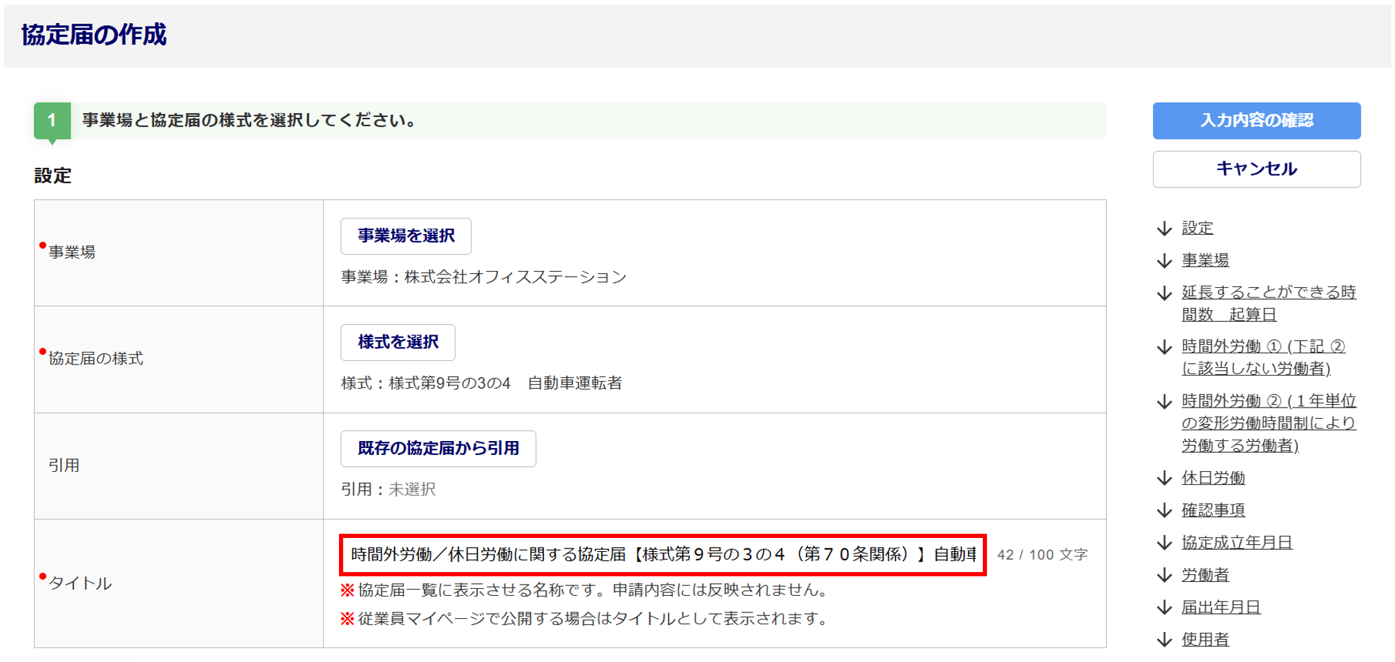 ※入力したタイトルは、協定届の内容へは反映せず、協定届一覧画面に表示します。
