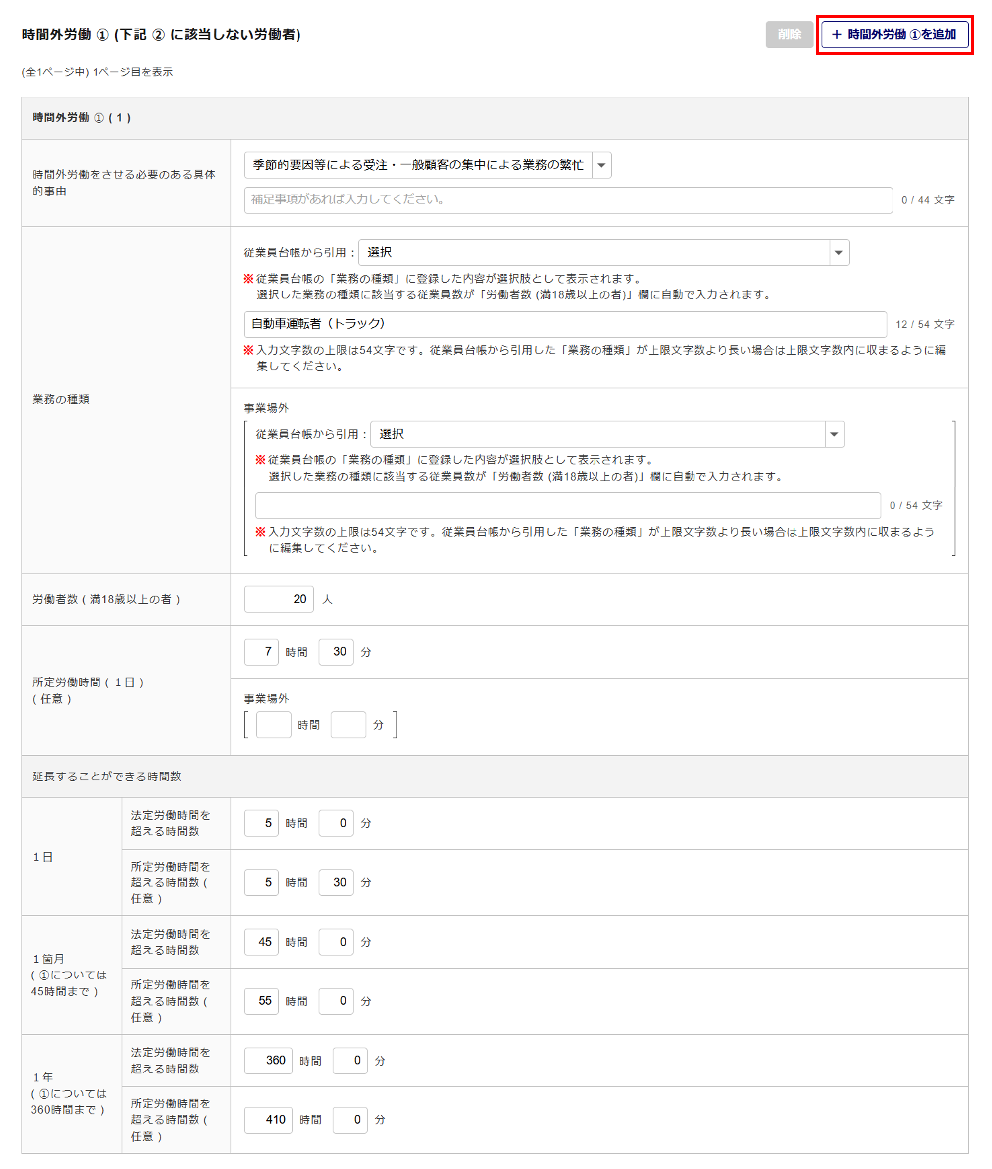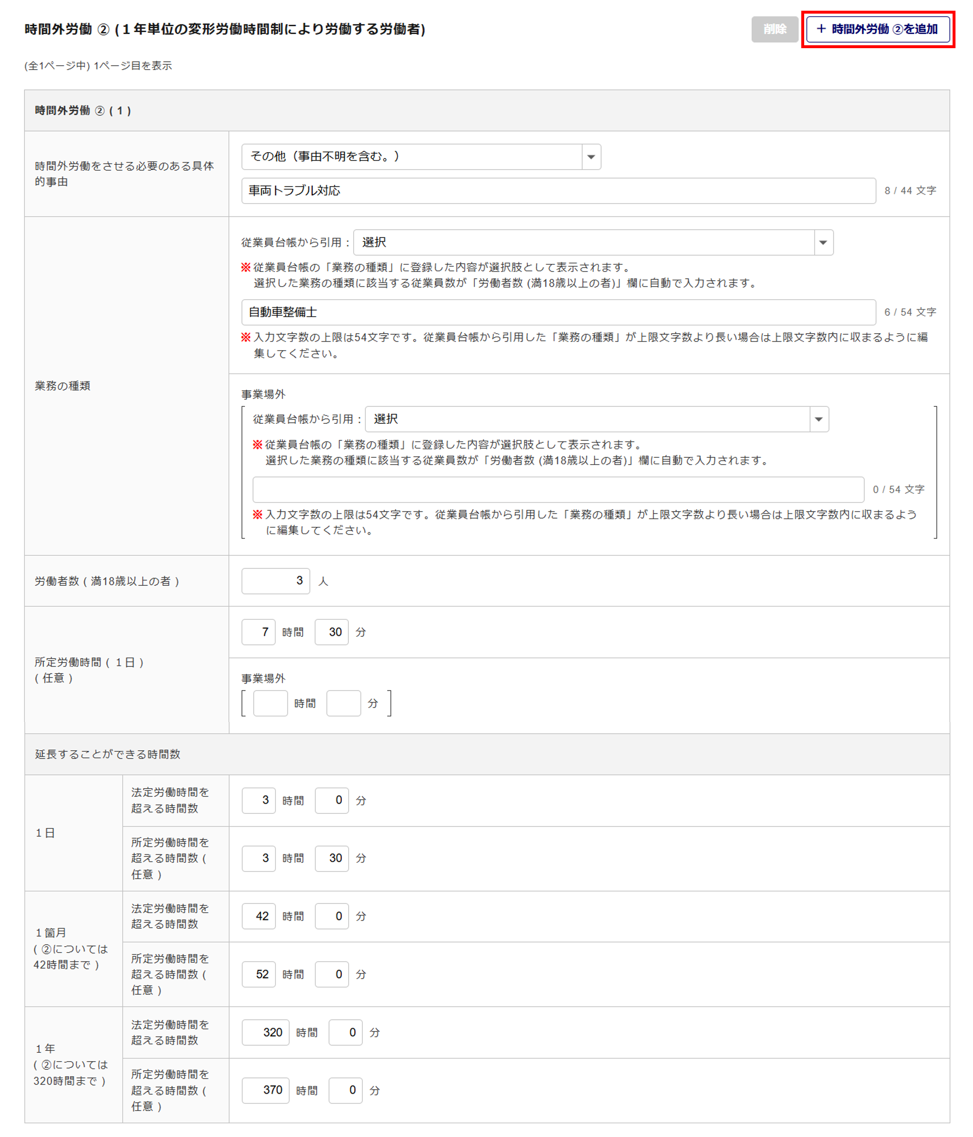 追加で情報を入力する場合は、[+時間外労働 ① を追加]をクリックします。