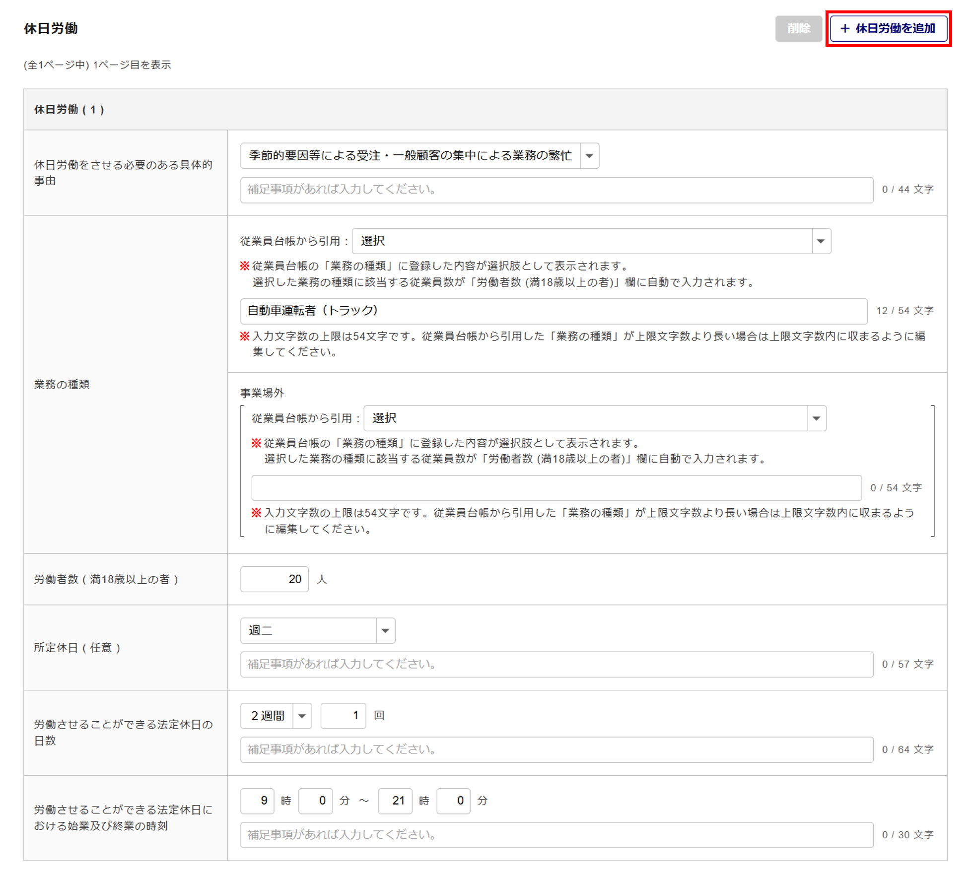 追加で情報を入力する場合は、[+休日労働を追加]をクリックします。