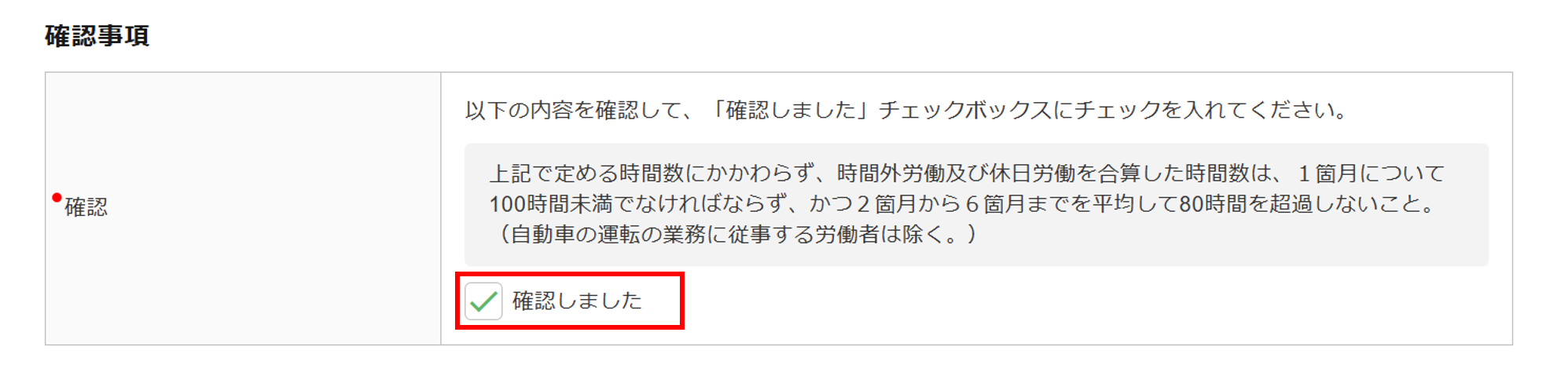 「確認しました」のチェックをした場合