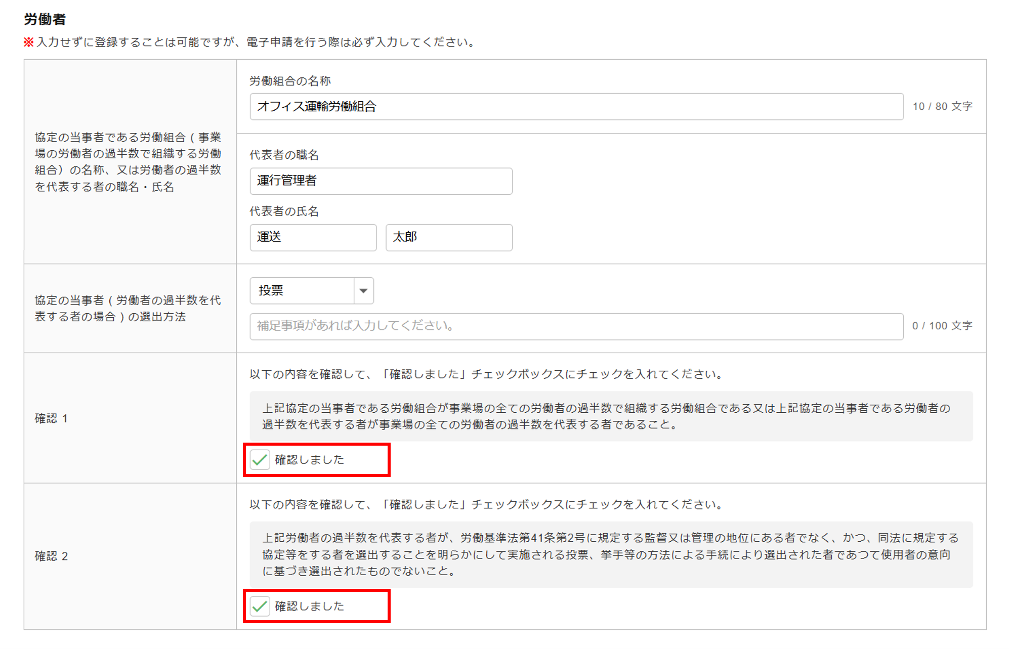 「労働組合の名称」もしくは、「代表者の職名」と「代表者の氏名」が必須入力となります。