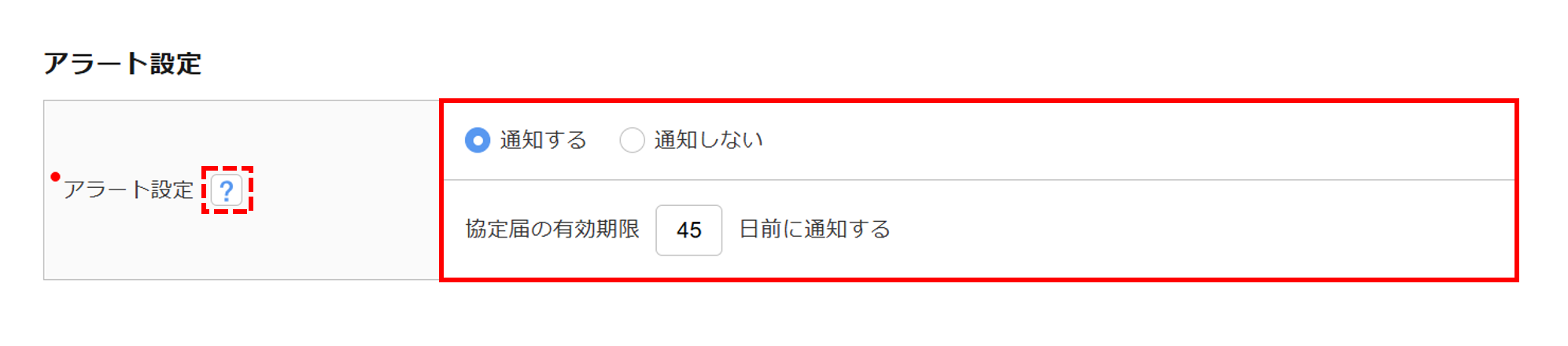 表示されるタイミングについては、「協定届の有効期限〇日前に通知する」で日付の設定ができます。