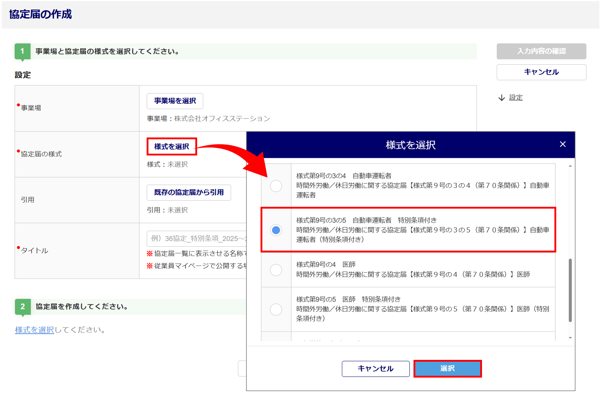 [様式を選択]から「様式第9号の3の5 自動車運転者 特別条項付き 時間外労働/休日労働に関する協定届【様式第9号の3の5(第70条関係)】自動車運転者(特別条項付き)」を選択後、[選択]をクリックします。