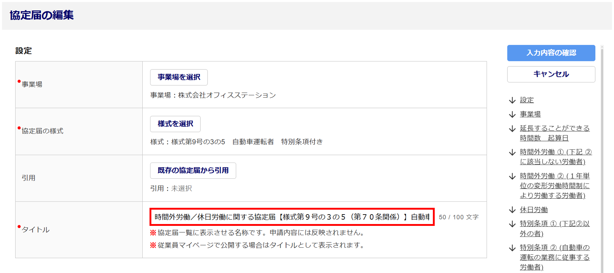 ※入力したタイトルは、協定届の内容へは反映せず、協定届一覧画面に表示します。