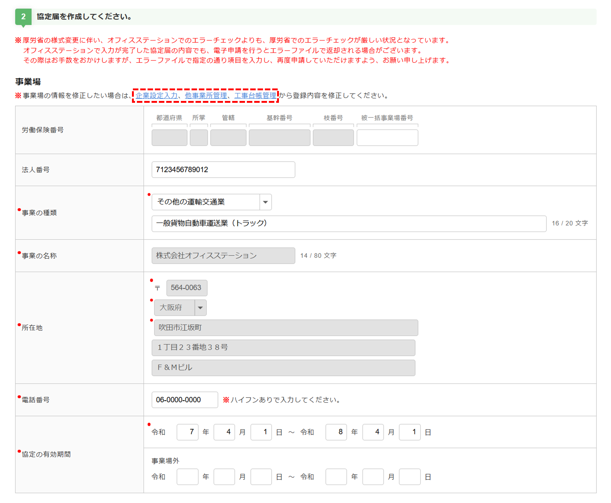 事業場の情報は、[事業場を選択]で選択した事業場情報を引用します。