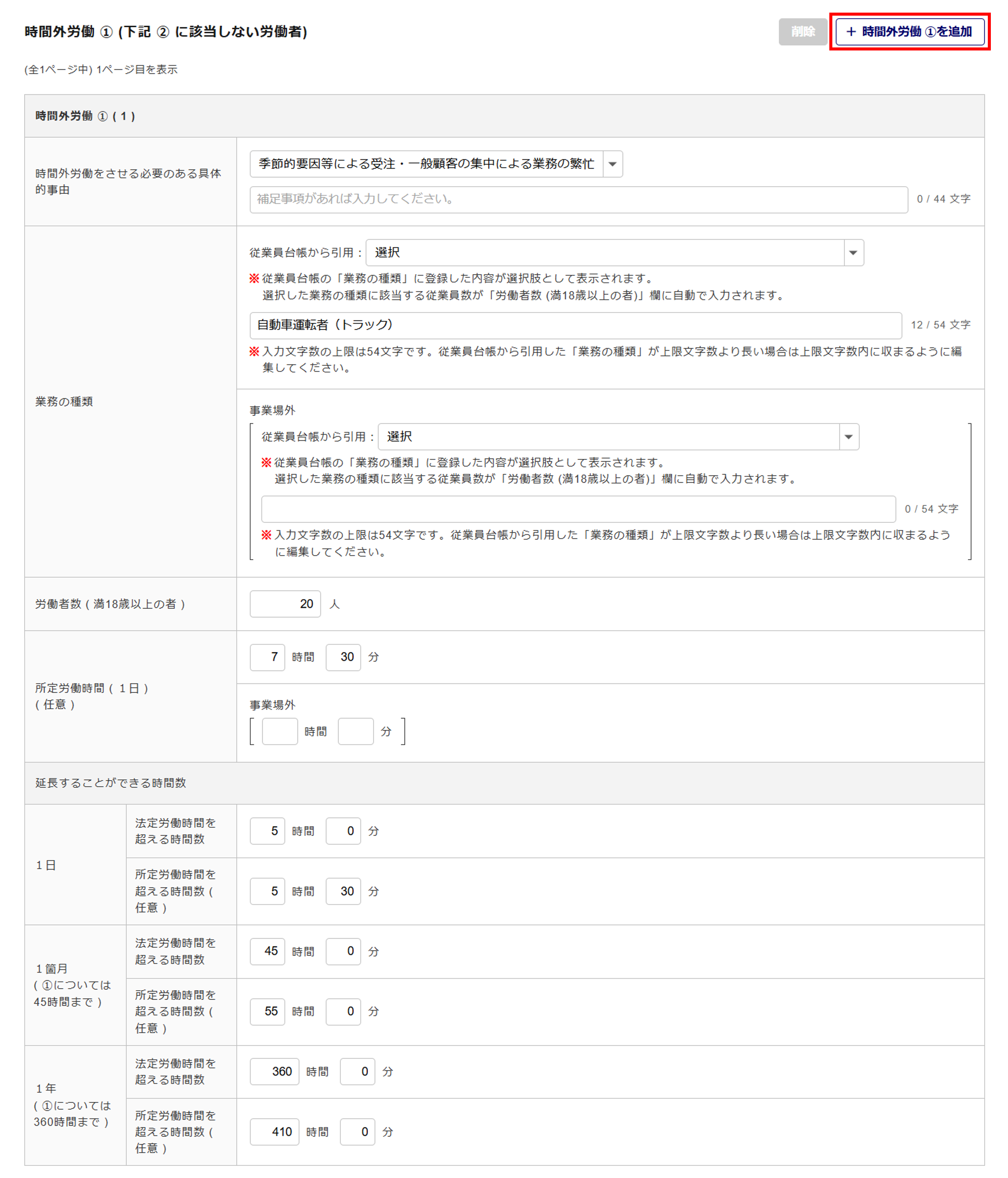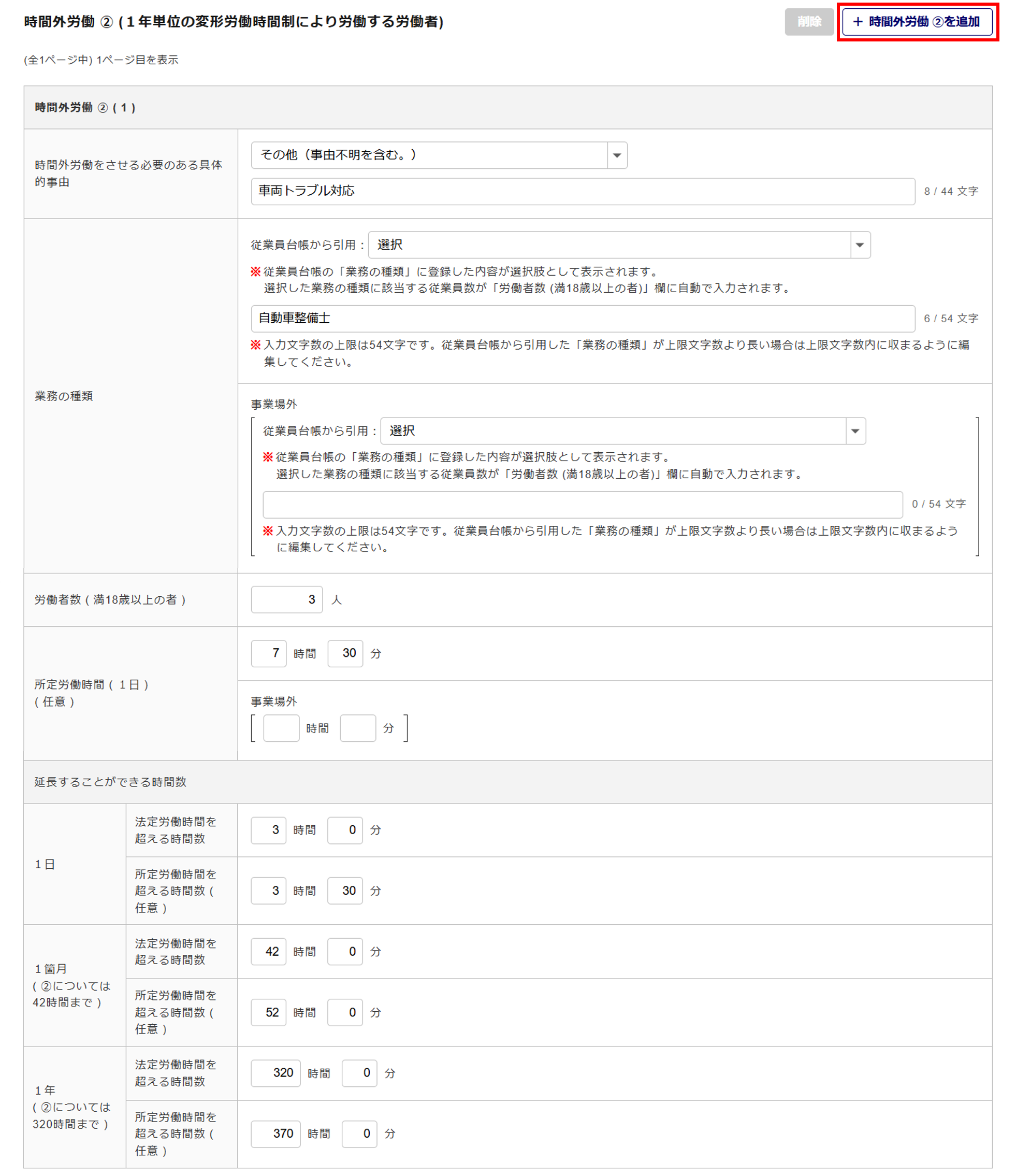 追加で情報を入力する場合は、[+時間外労働 ① を追加]をクリックします。