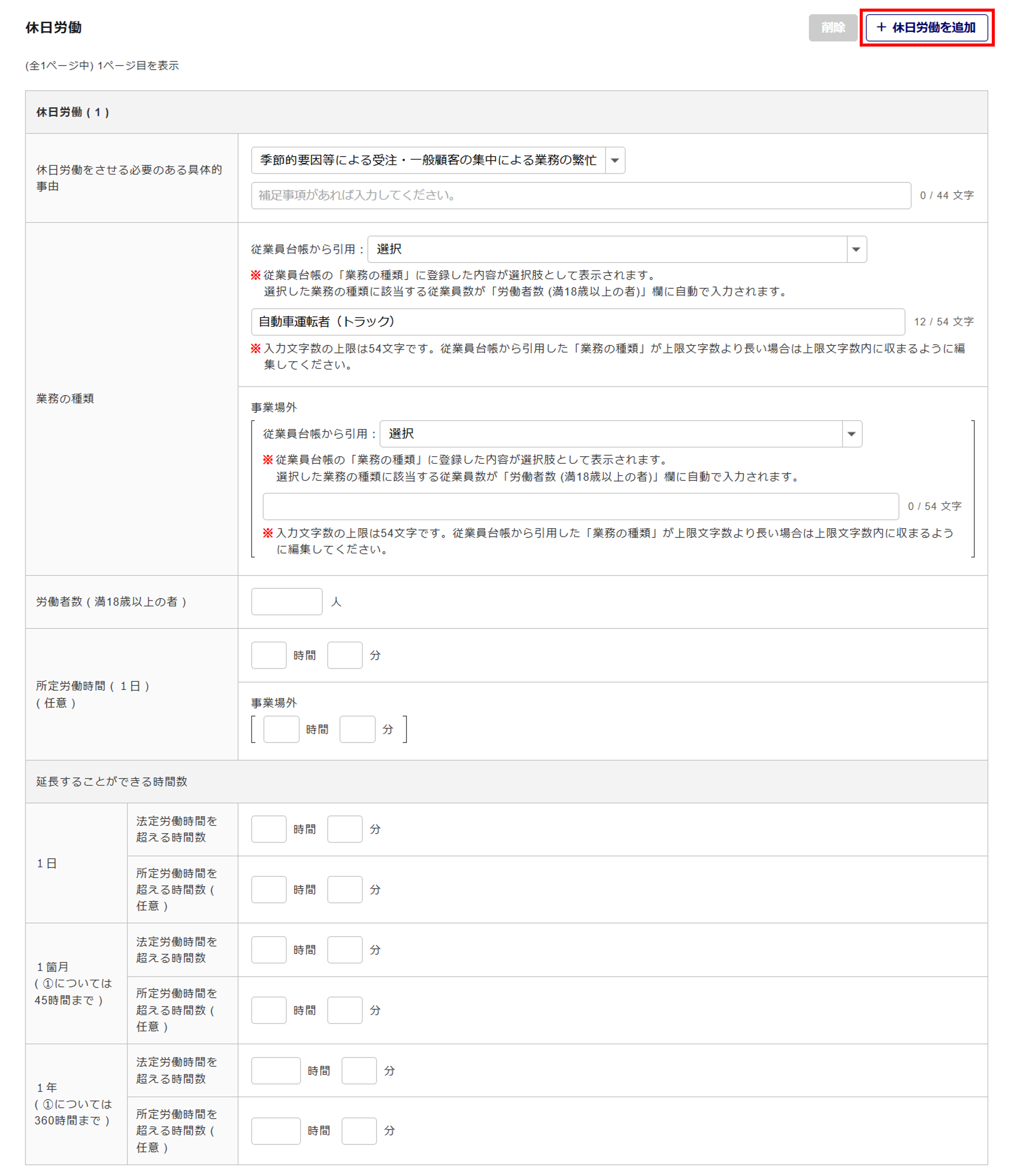 追加で情報を入力する場合は、[+休日労働を追加]をクリックします。