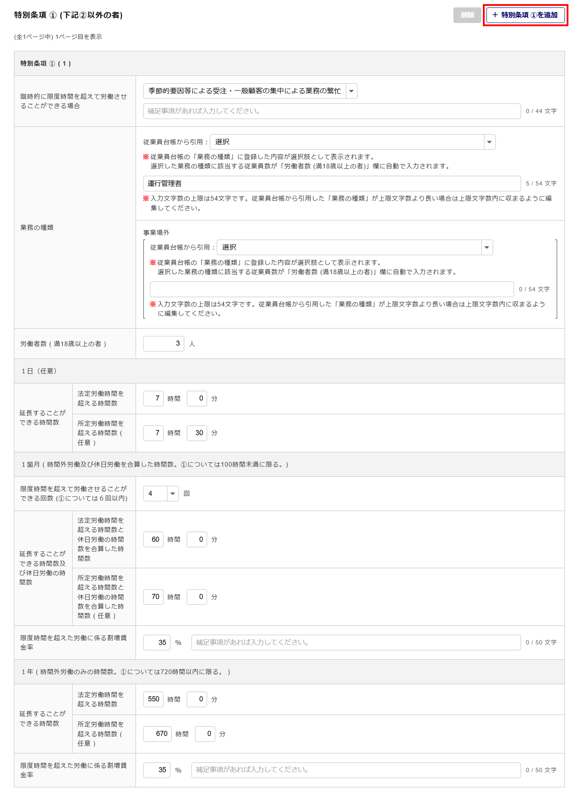 追加で情報を入力する場合は、[+特別条項①を追加]をクリックします。