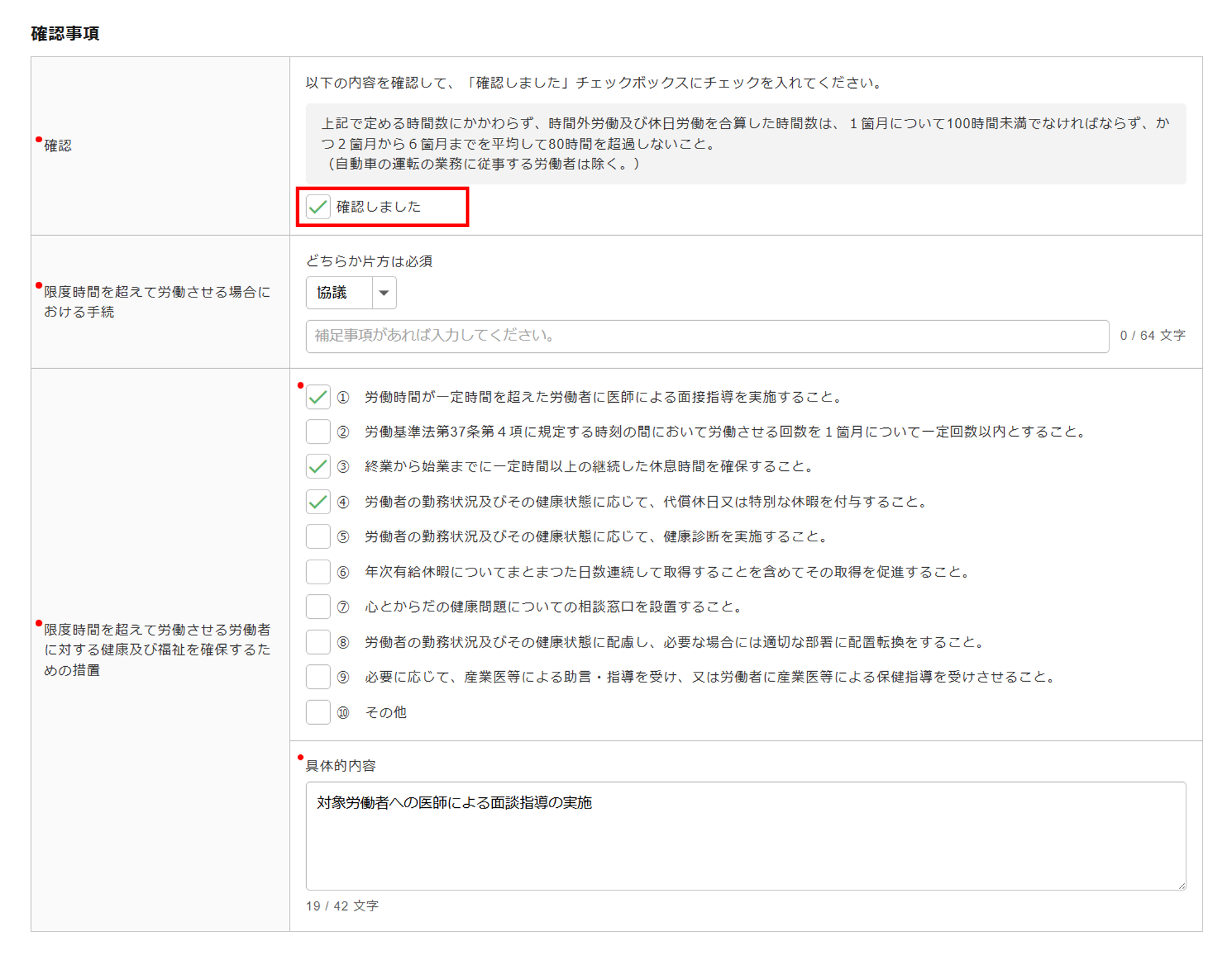 ※「限度時間を超えて労働させる労働者に対する健康及び福祉を確保するための措置」は複数選択可能です。
