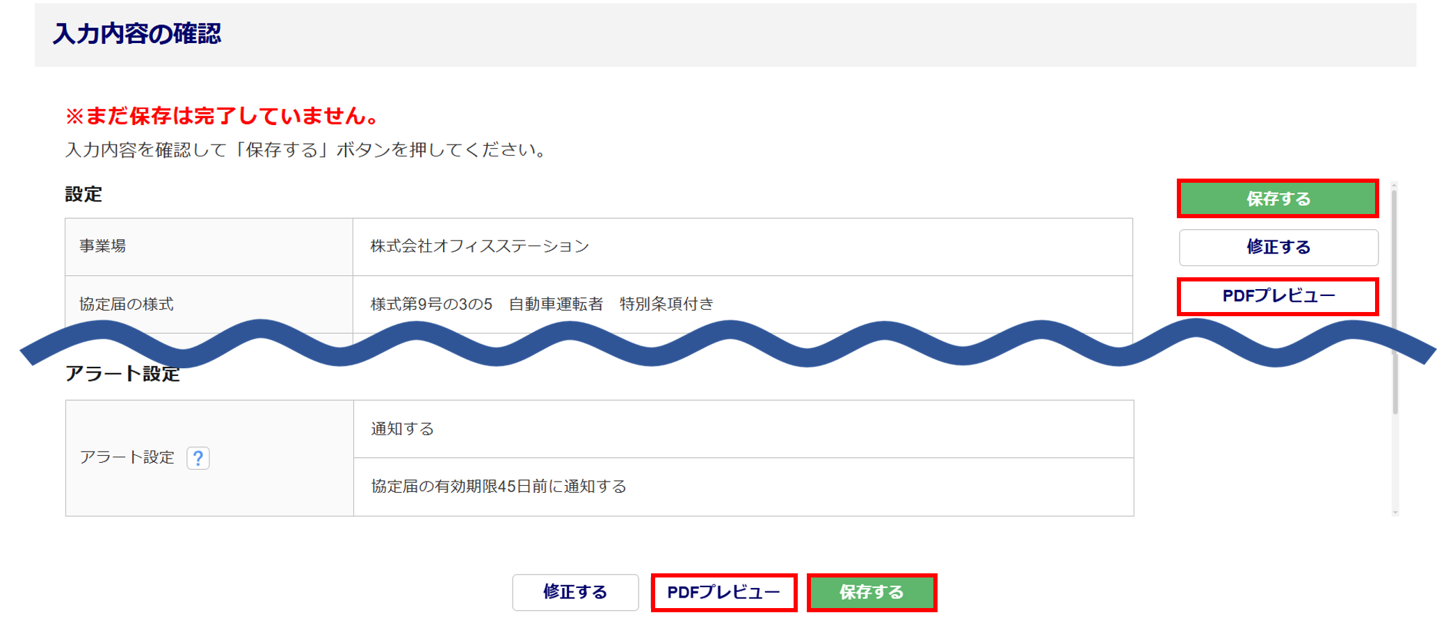 作成した協定届を保存すると、「確認」画面が表示されます。