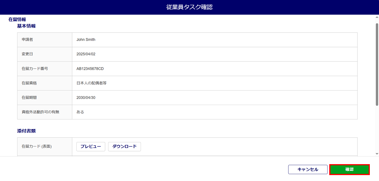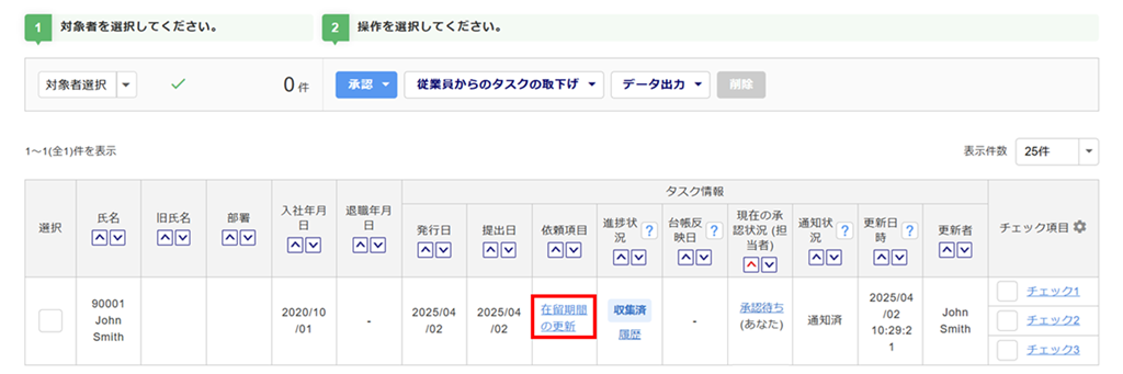 従業員から提出された在留期間の更新タスクを承認(決裁・確認)をおこなう方法について、ご説明します。