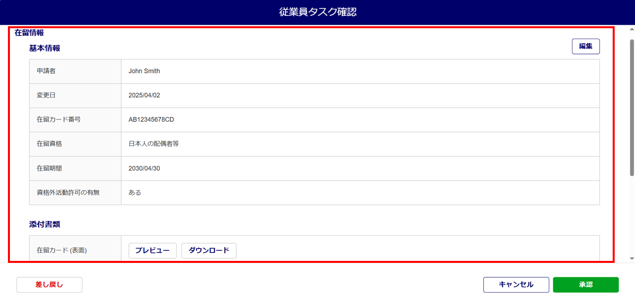 ・従業員台帳に在留情報の内容が即時反映されます。