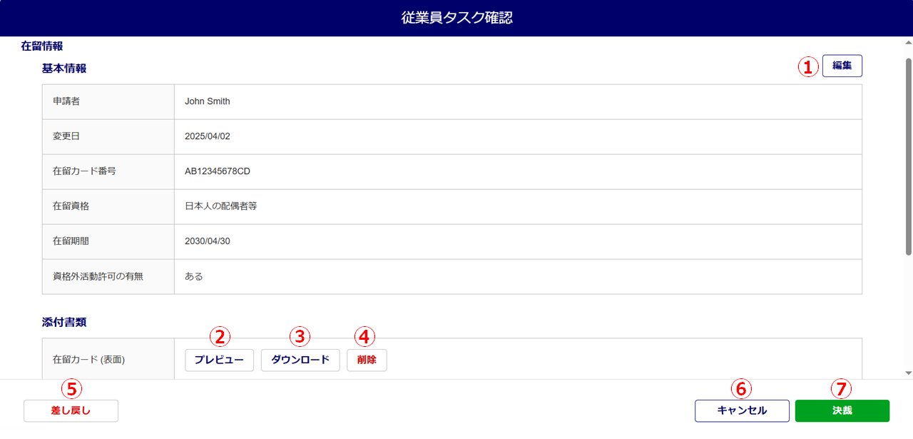 | ④ | 削除 * | 在留資格の提出書類画像のファイルを削除します。 ※「決裁」時、「管理者」権限あるいは「一般」権限「編集可」の利用者の 場合のみ表示されます。 |