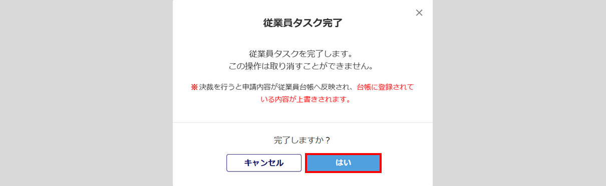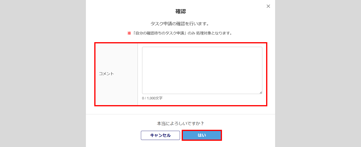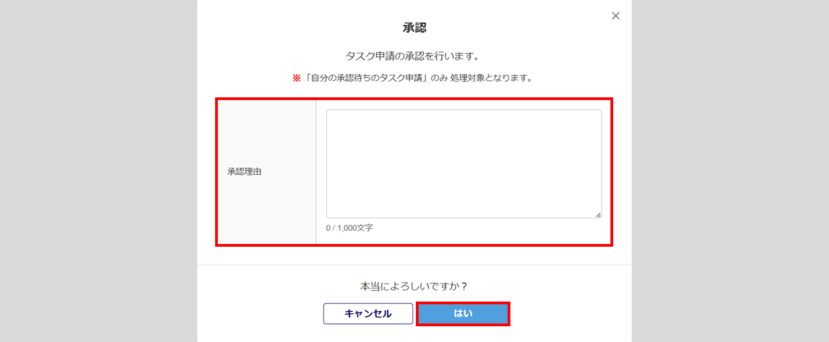 「承認理由」を入力し、[はい]をクリックします。「承認理由」の入力は任意です。