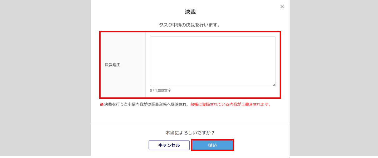 「決裁理由」を入力、[はい]をクリックします。「決裁理由」の入力は任意です。