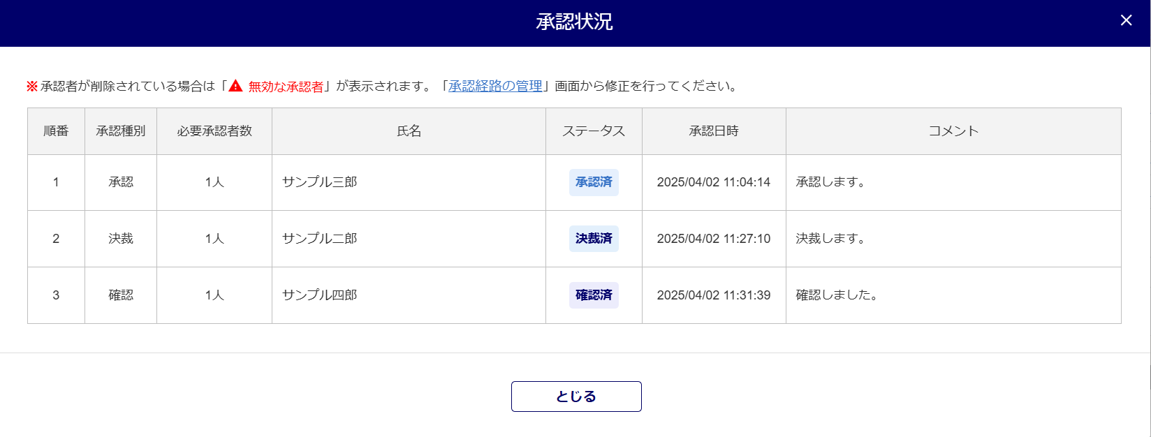 「現在の承認状況(担当者)」列の「完了」の青文字部分をクリックすると「承認状況」を確認できます。