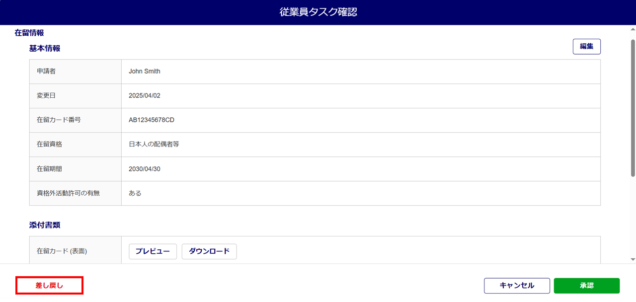 従業員から提出された内容に不備があり、従業員本人に情報の修正を依頼する場合は、差し戻しをおこないます。