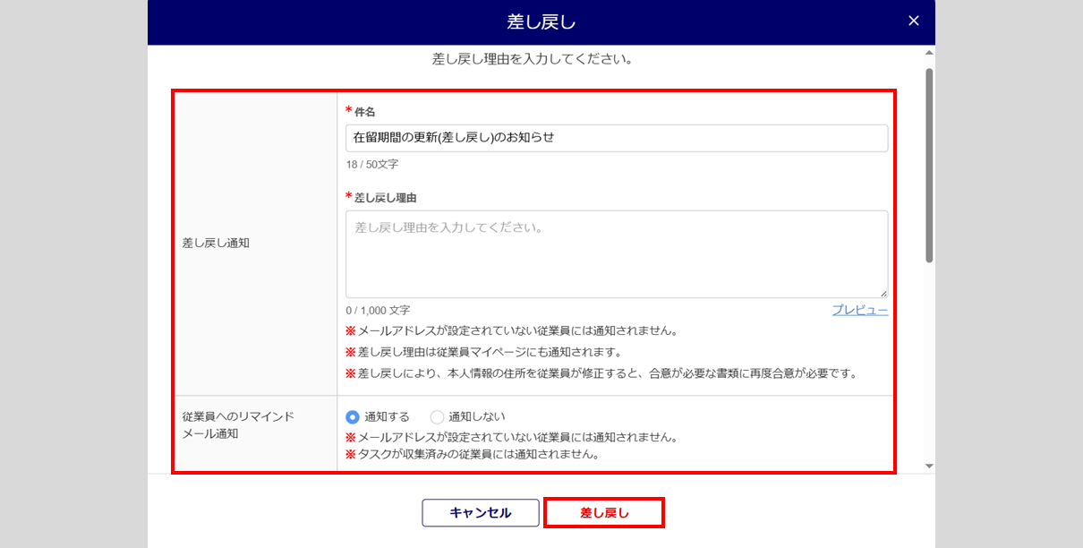「差し戻し通知」「従業員へのリマインドメール通知」を設定し、[差し戻し]をクリックします。
