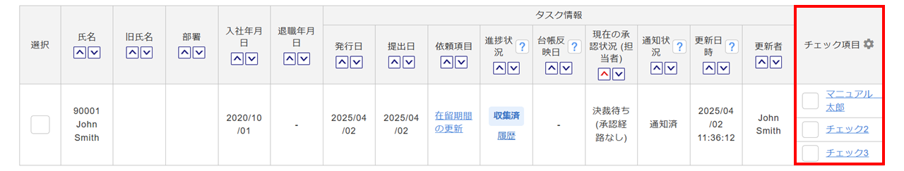 例)チェック1→マニュアル太郎(ログイン者の氏名)