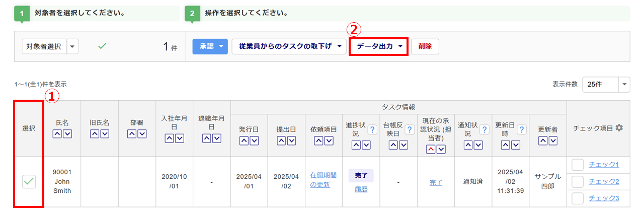 出力対象の「選択」列(①)にチェックし、[データ出力](②)をクリックします。