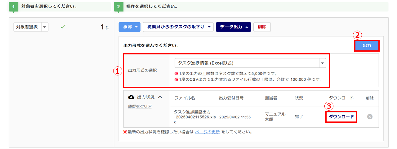 「出力状況」欄が表示されます。[ダウンロード](③)をクリックすると、ファイルをダウンロードできます。