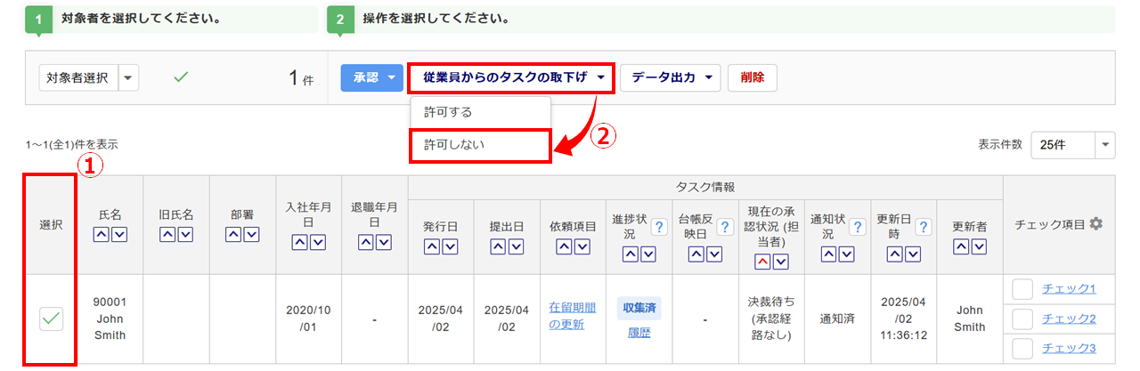 取下げを不可にする従業員の「選択」列(①)にチェックし、[従業員からのタスクの取下げ]>[許可しない](②)をクリックします。
