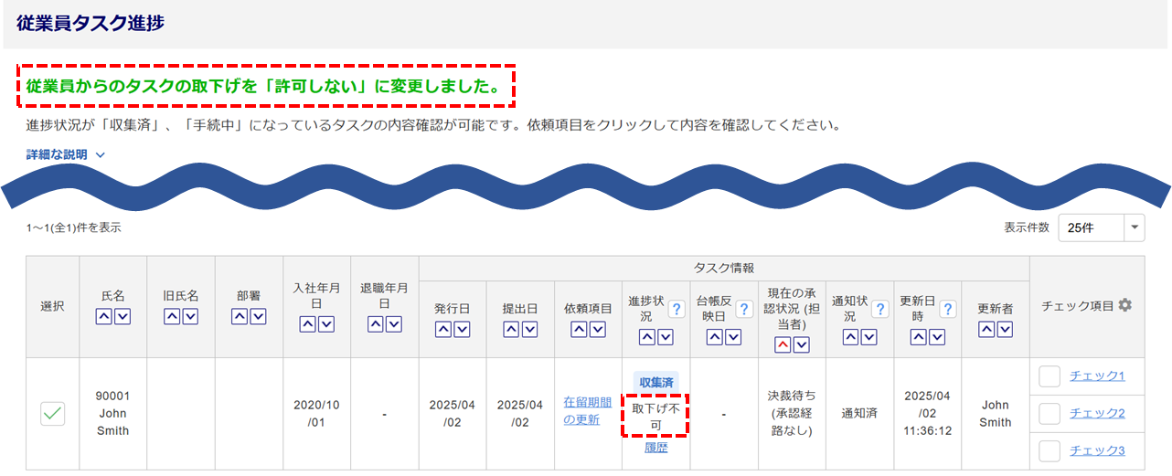 画面上部に「従業員からのタスクの取下げを「許可しない」に変更しました。」と表示され、「進捗状況」列に「取下げ不可」と表示されたら、タスク取下げの設定は完了です。