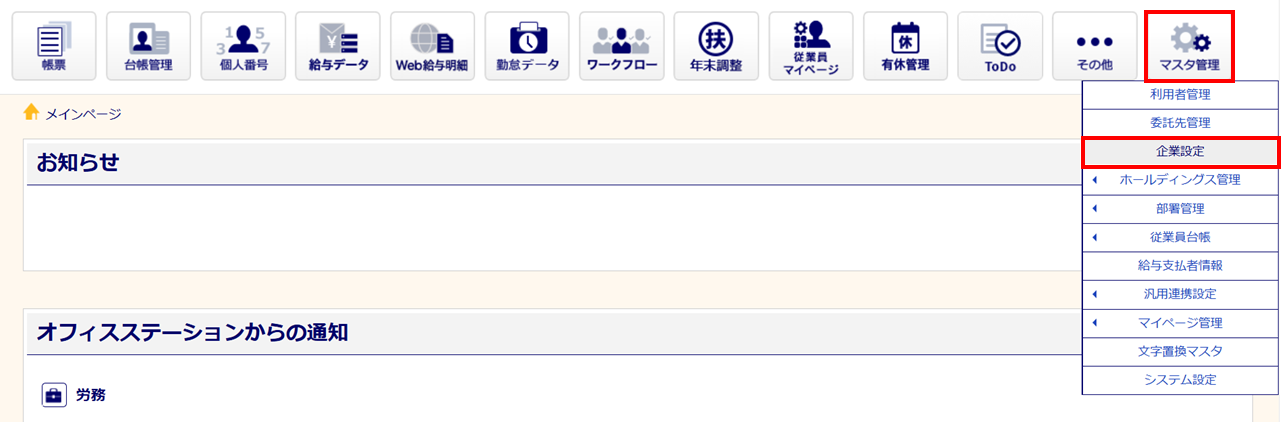 ログイン者に「管理者」権限がない場合、「企業設定」項目は表示されません。