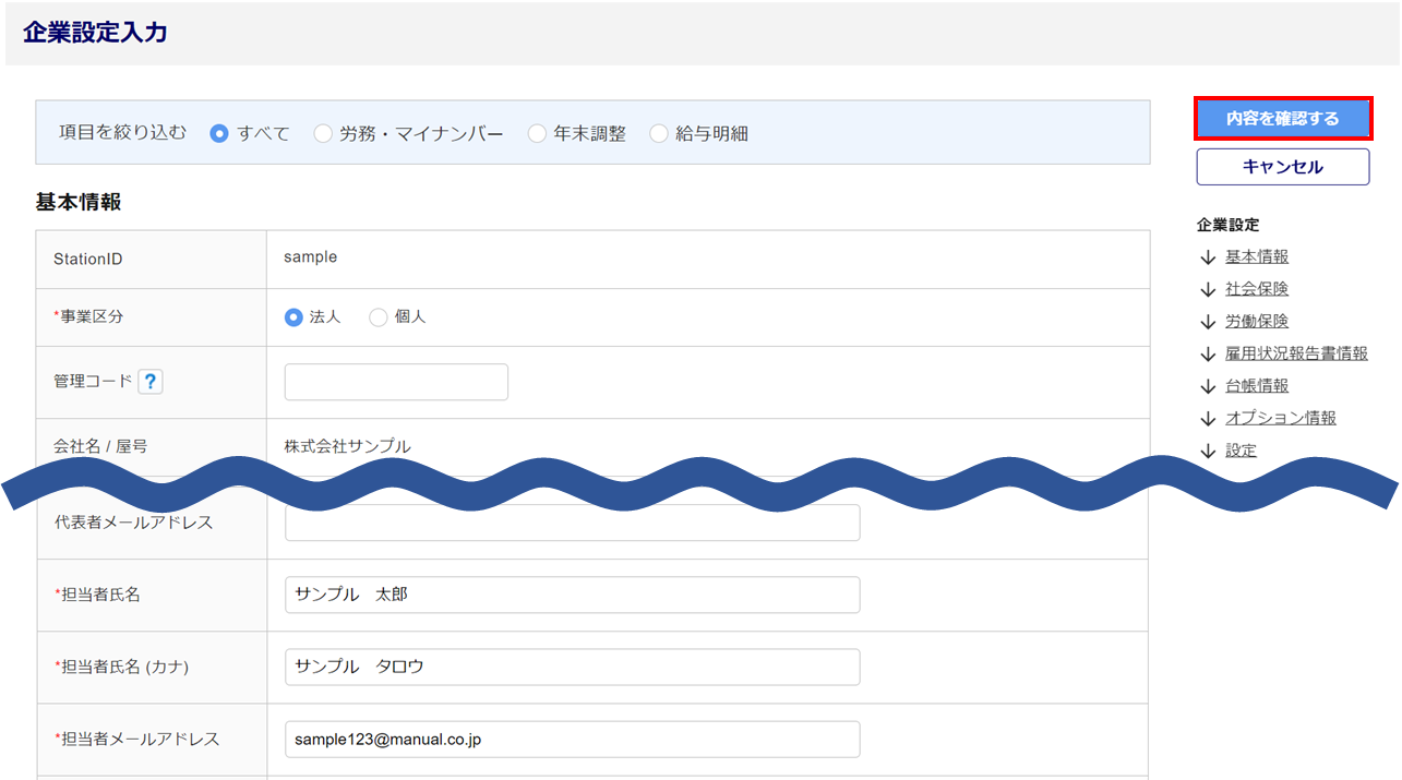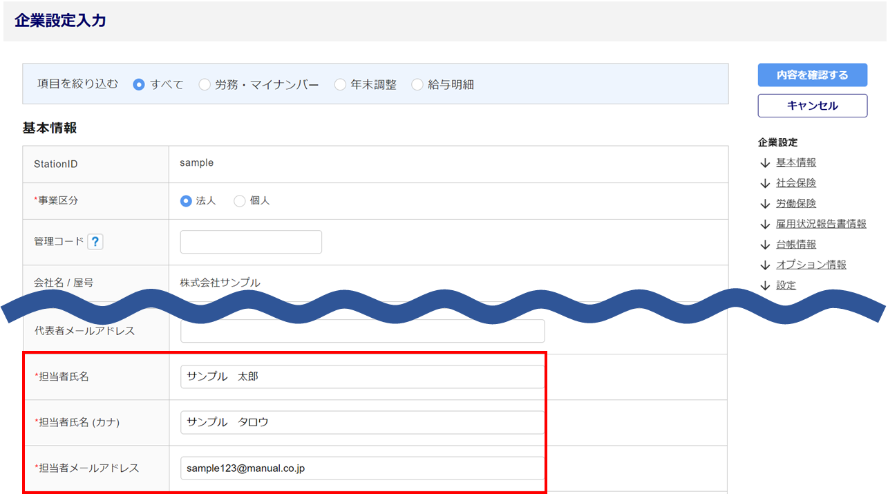 「担当者氏名」、「担当者氏名(カナ)」、「担当者メールアドレス」に新しい担当者情報を入力します。