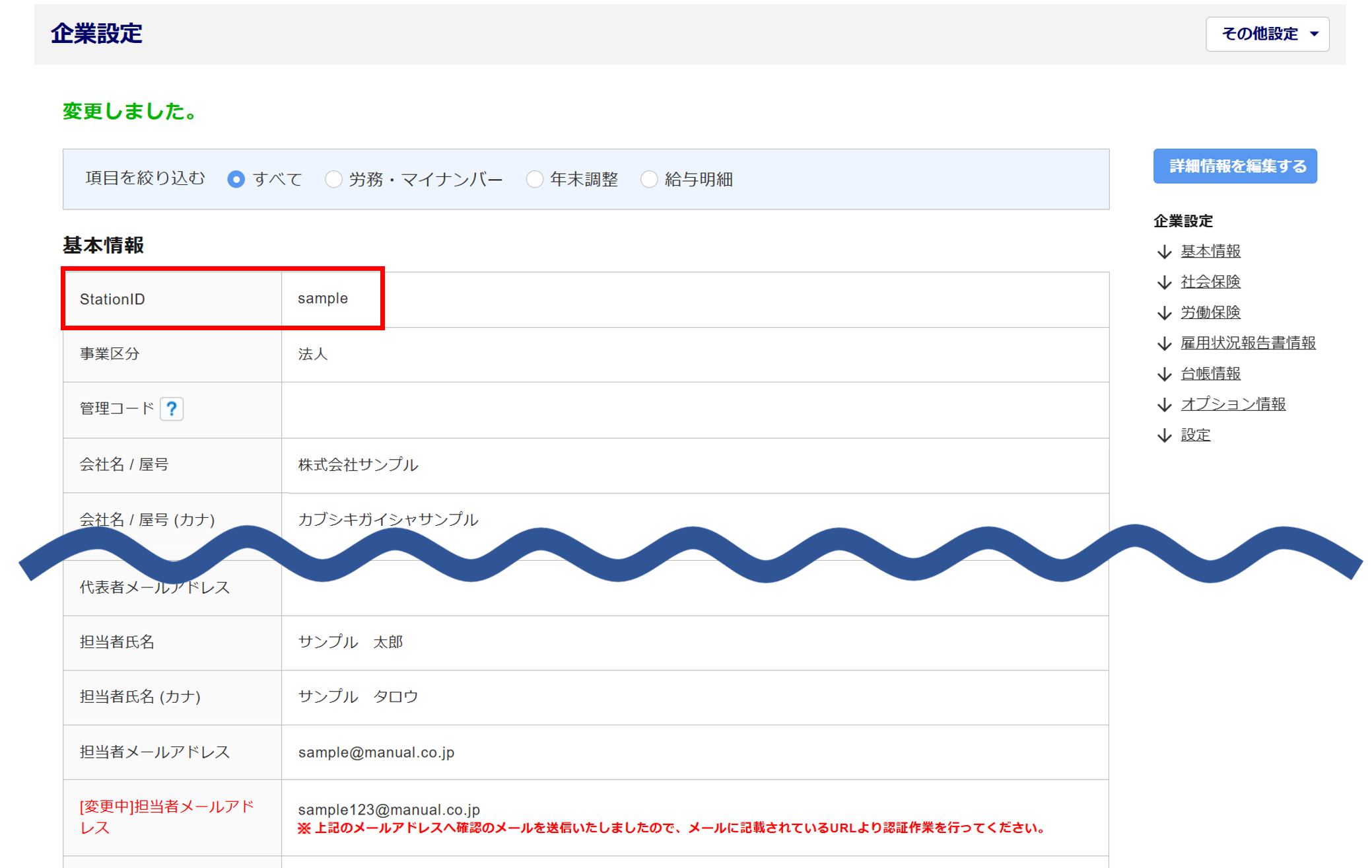 24時間以内に認証作業ができなかった場合、再度 「担当者メールアドレス」 を変更してください。