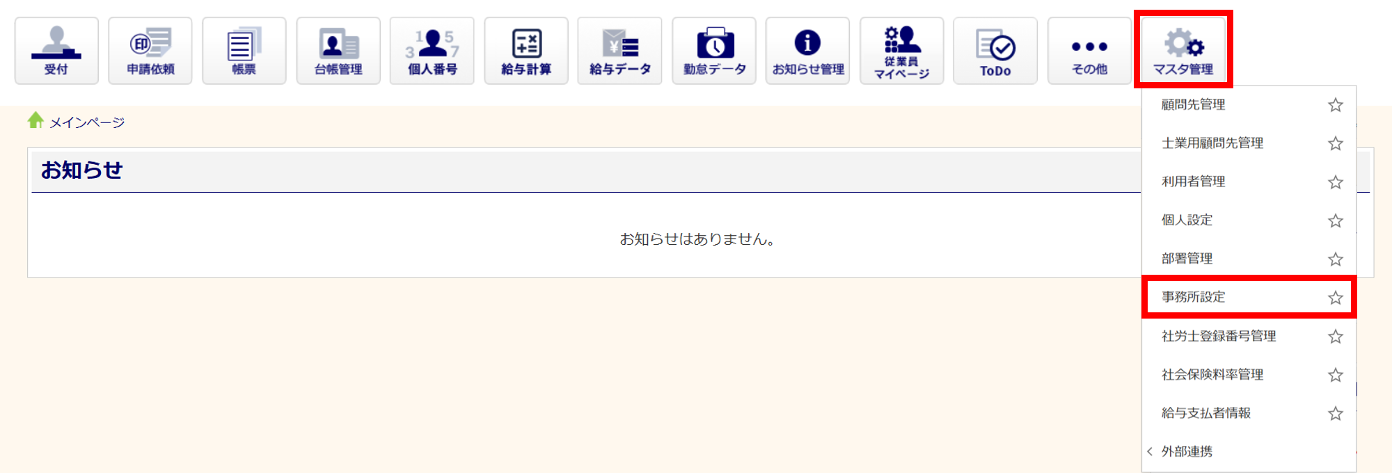 [マスタ管理]>[事務所設定]をクリックします。