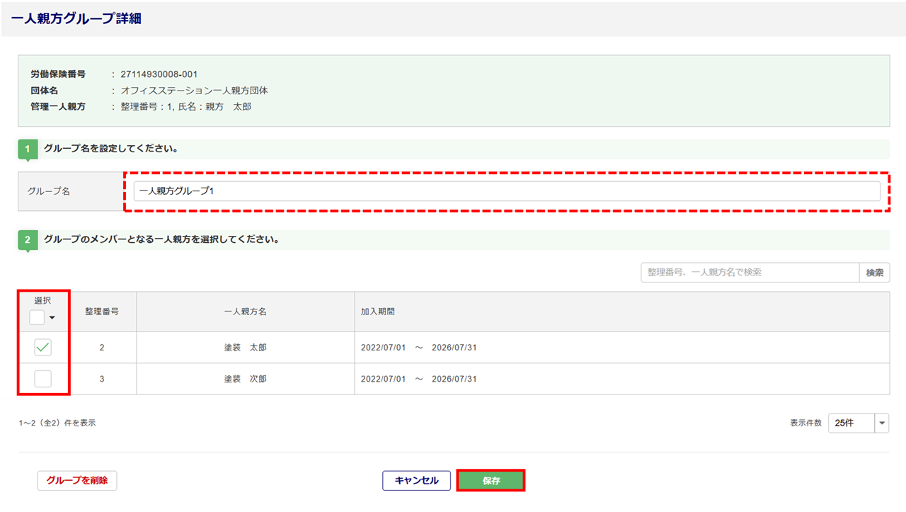 追加するメンバーの一人親方の「選択」列にチェックし、[保存]をクリックします。