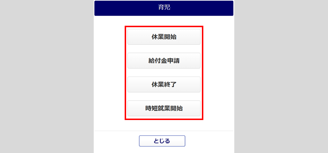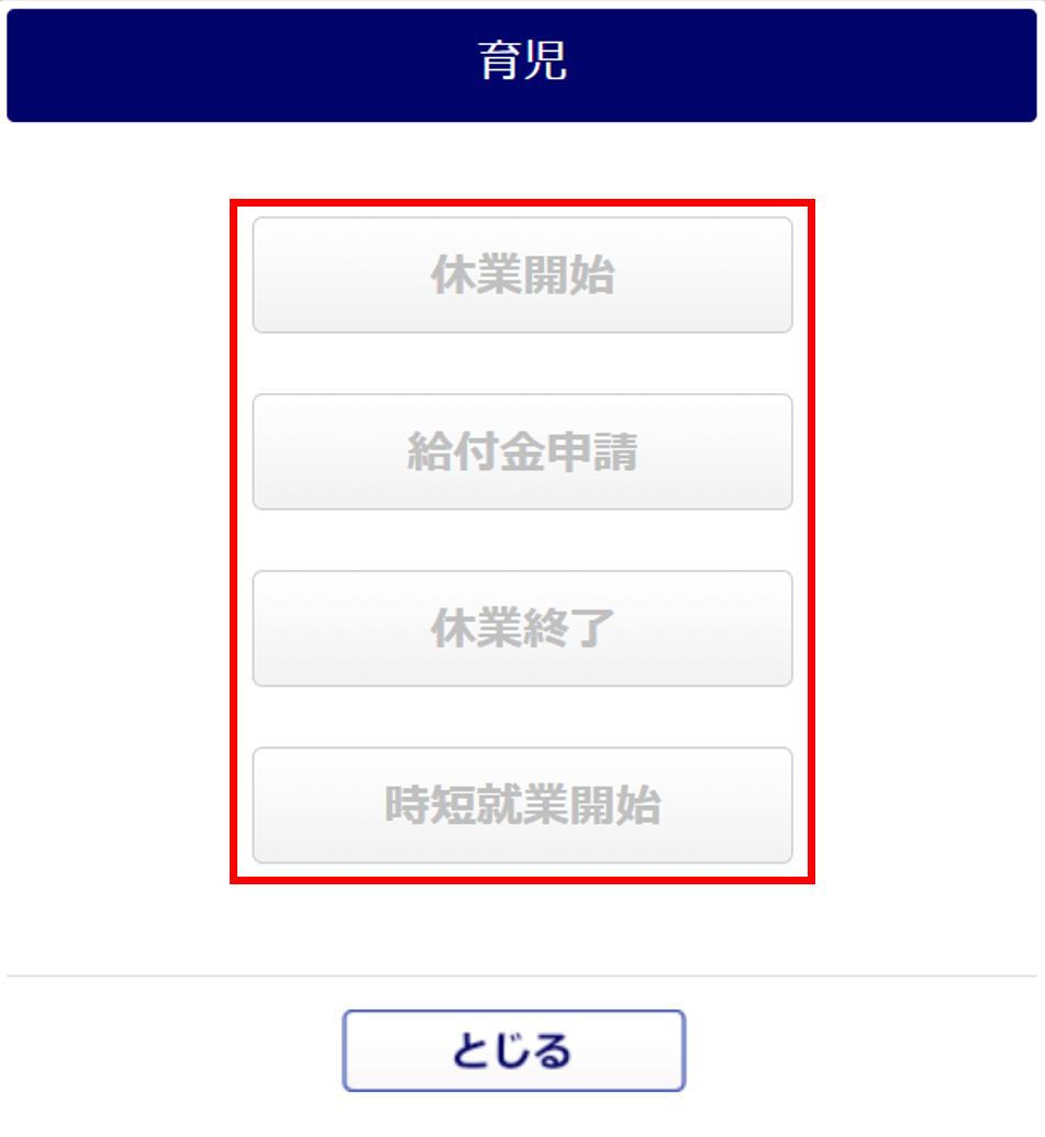 利用者の「給与情報の取り扱い」が「不可」となっている場合、「育児」画面の、申請する種類がグレーアウトし、申請をおこなうことができません。[マスタ管理]>[利用者管理]をご確認ください。