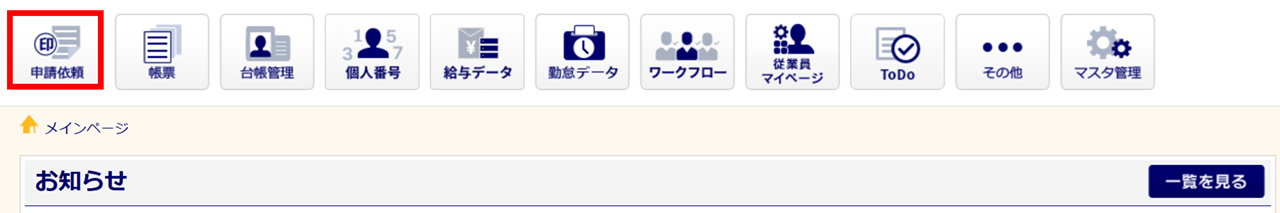 [申請依頼]アイコンが表示されていない場合、[マスタ管理]>[利用者管理]をご確認ください。