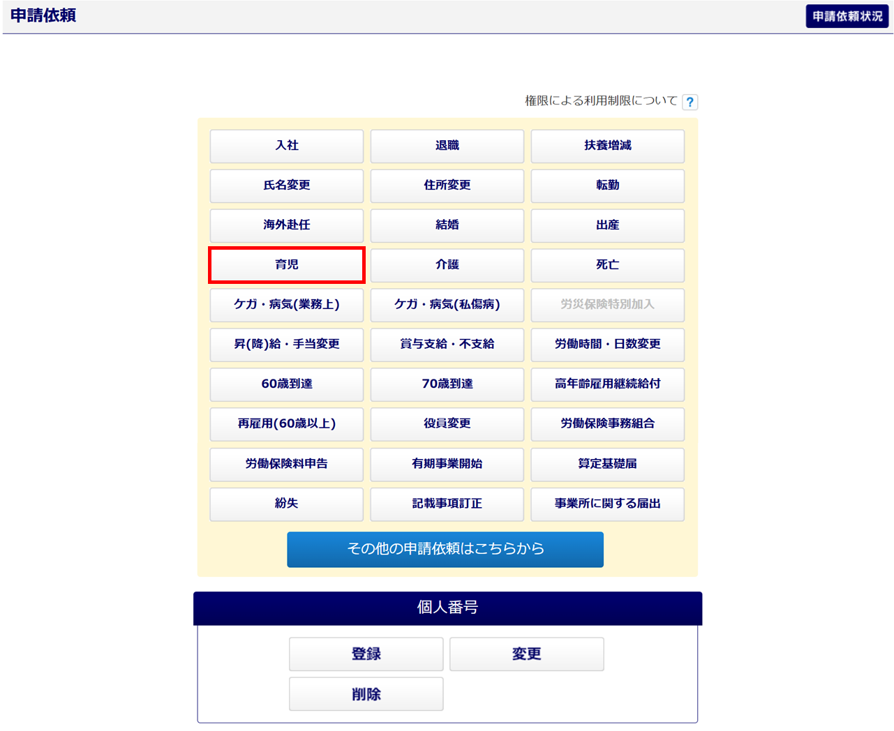 委託先社労士へ、「育児」の「休業開始」「給付金申請」「休業終了」「時短就業開始」の申請依頼をおこなう方法をご説明します。