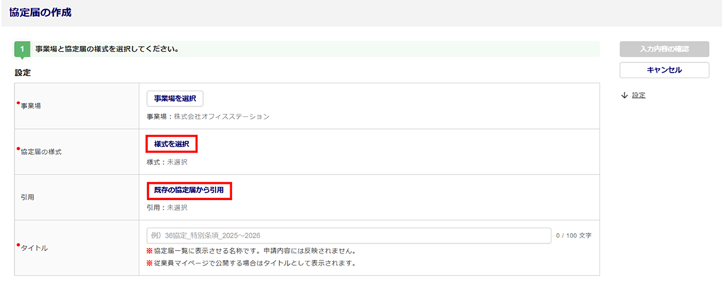 協定届の内容を設定します。「●(赤丸)」が表示されている項目は、作成にあたり必ず設定が必要です。