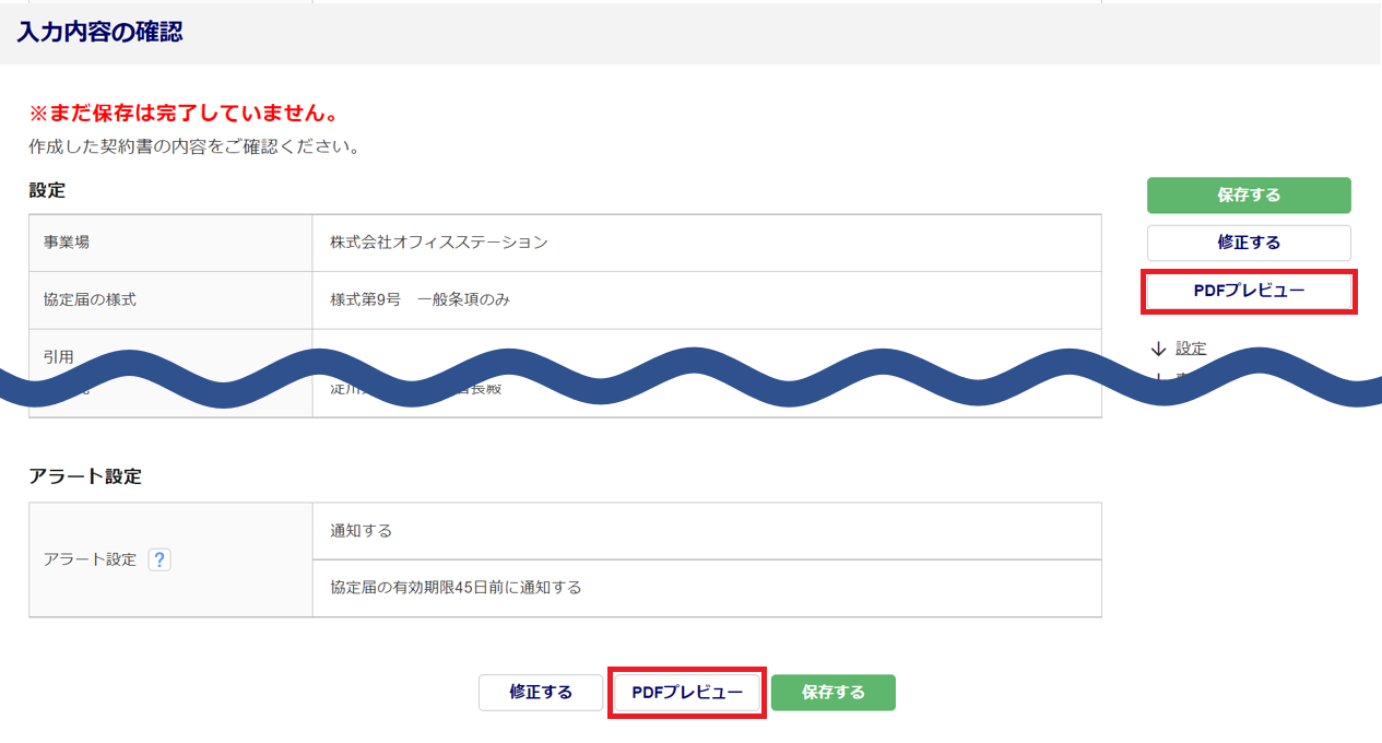[PDFプレビュー]をクリックすると、入力や設定内容を反映した情報を様式へ反映し確認できます。