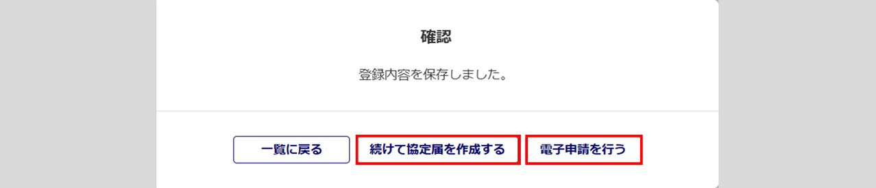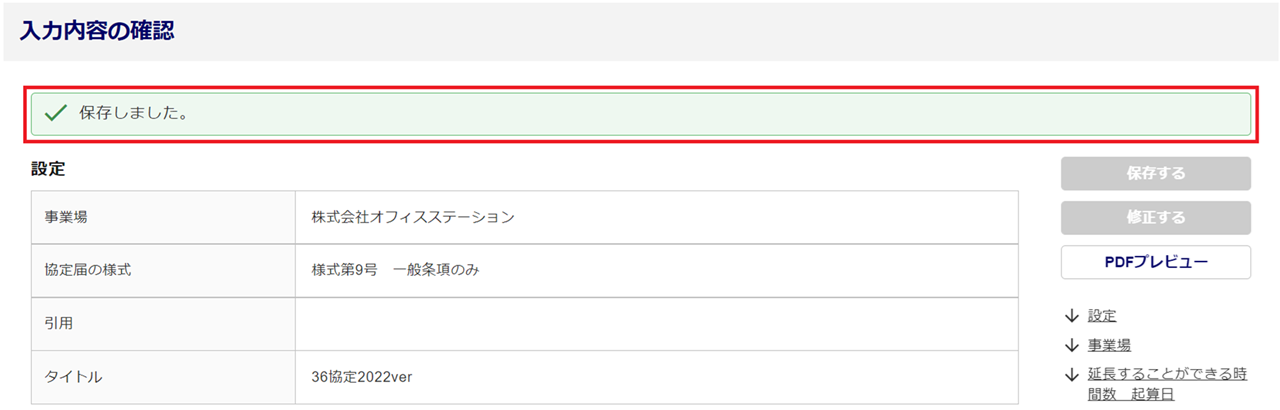 「保存しました。」と表示されたら、協定届の作成は完了です。