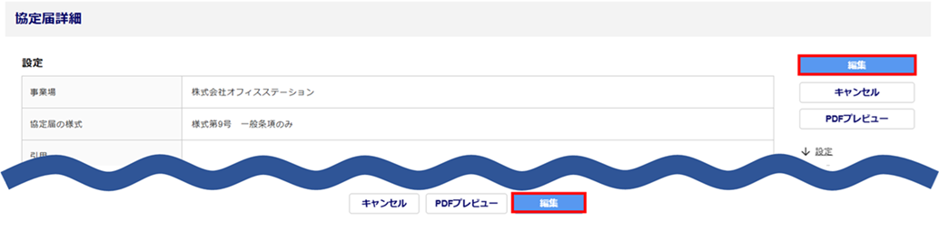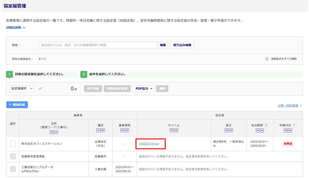 協定届管理画面にて[協定届のタイトル名]をクリックすると、作成した協定届を確認できます。