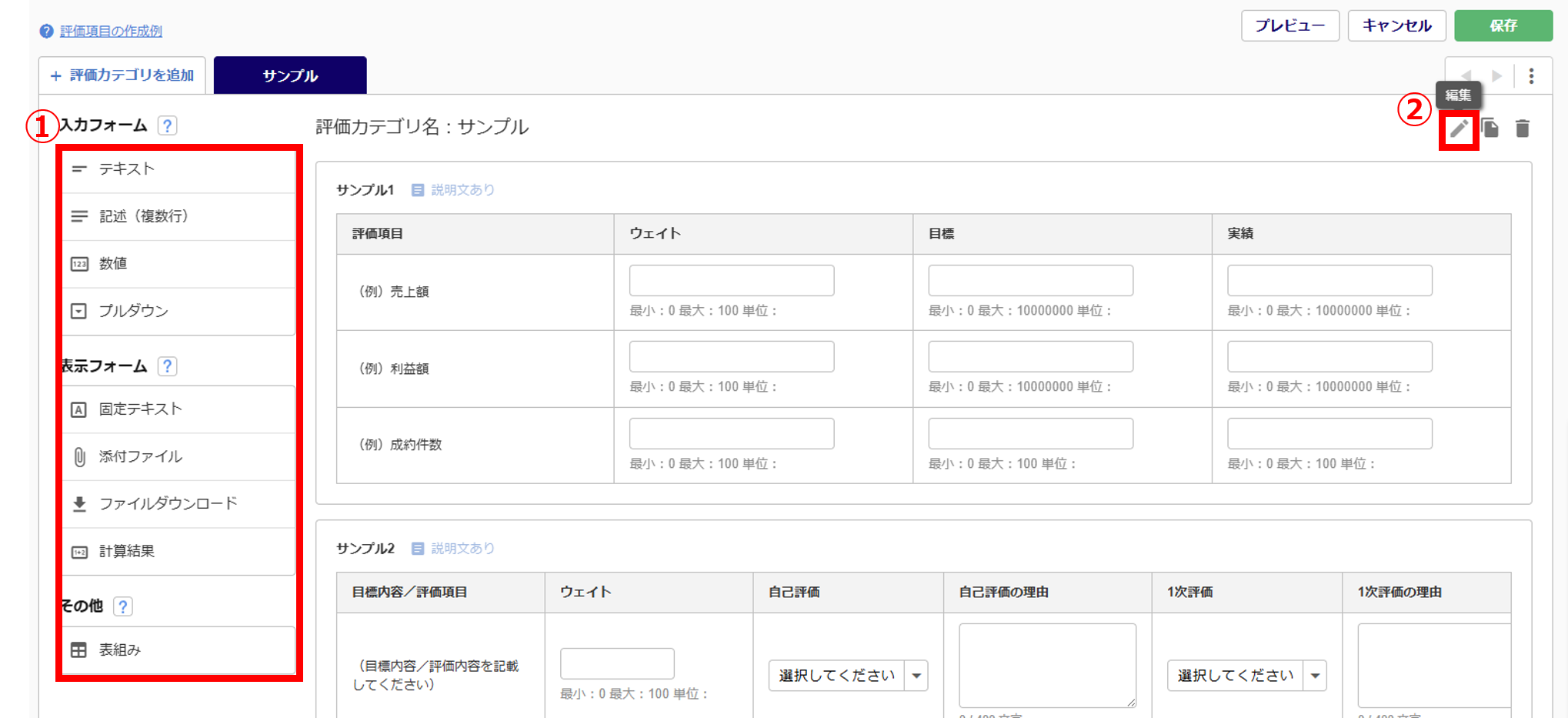 「タスク」(①)を選択後、評価カテゴリ(タブ)(②)を選択します。