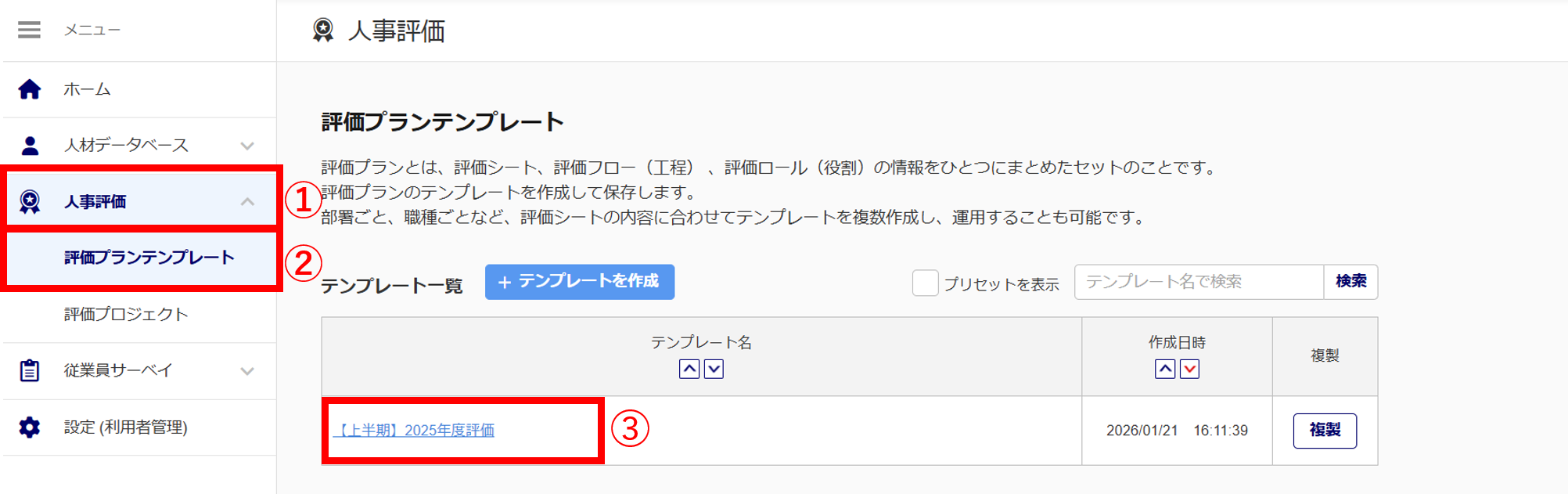 メニュー[人事評価](①)>[評価プランテンプレート](②)>対象のテンプレート名(③)をクリックします。