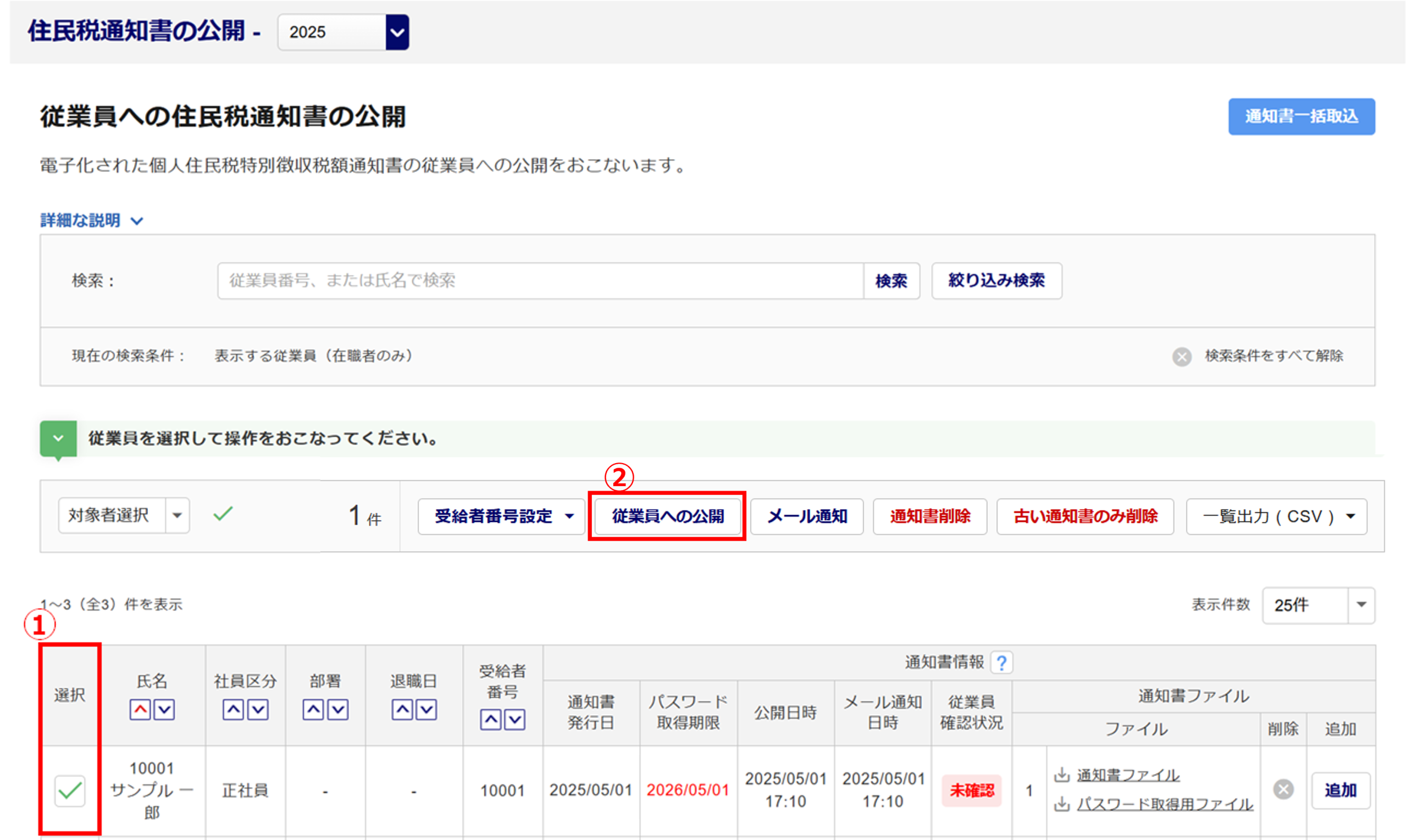 従業員マイページに住民税通知書を公開する対象従業員の「選択」列(①)にチェックし、[従業員への公開](②)をクリックします。