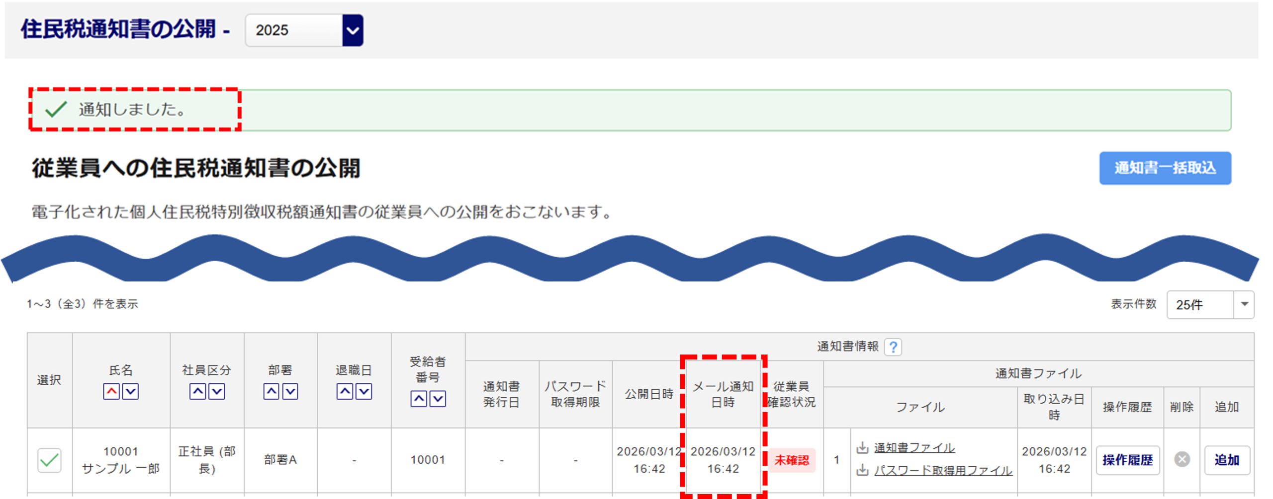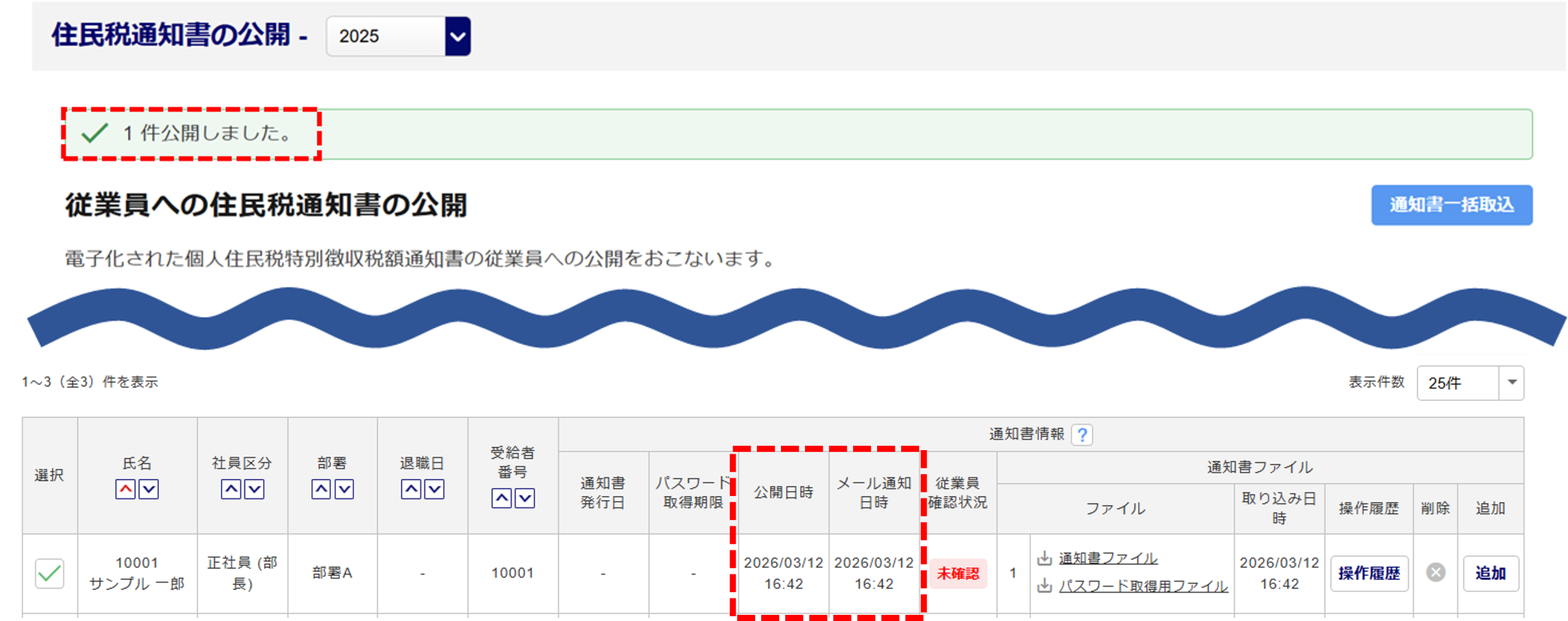 画面上部に「〇件公開しました。」と表示されたら、住民税通知書の公開は完了です。