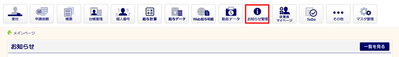 [お知らせ管理]アイコンが表示されるのは「管理者」権限の利用者のみです。