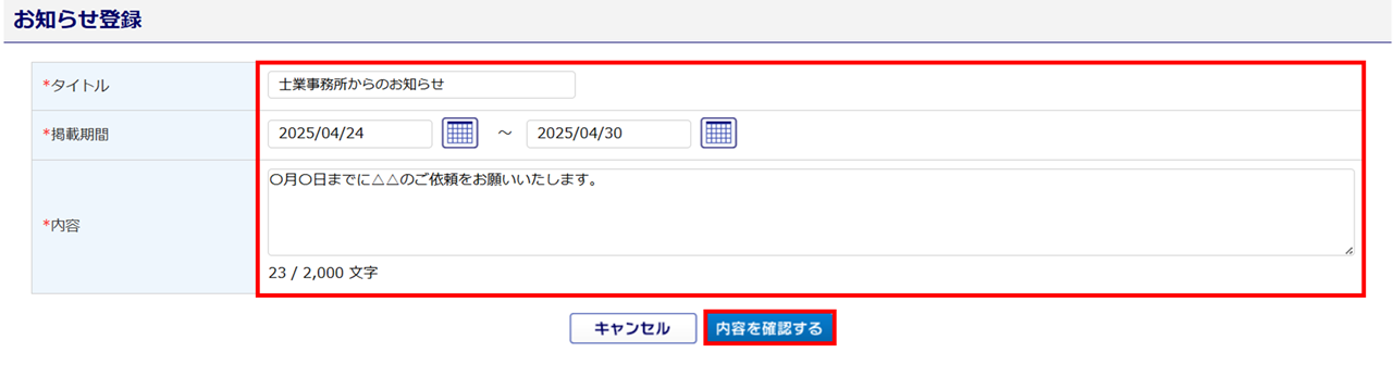 ※お知らせを作成する利用者の担当顧問先以外にも公開されます。