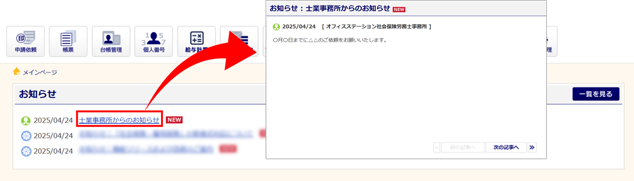 メインページの「お知らせ」欄に表示され、クリックすると内容を確認できます。