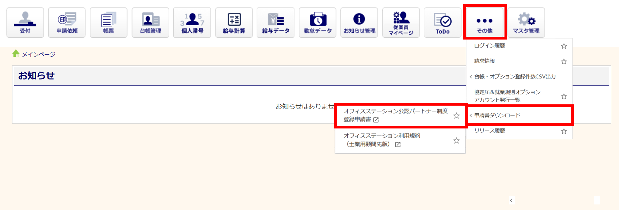 [その他]>[申請書ダウンロード]>[オフィスステーション公認パートナー制度 登録申請書]をクリックします。