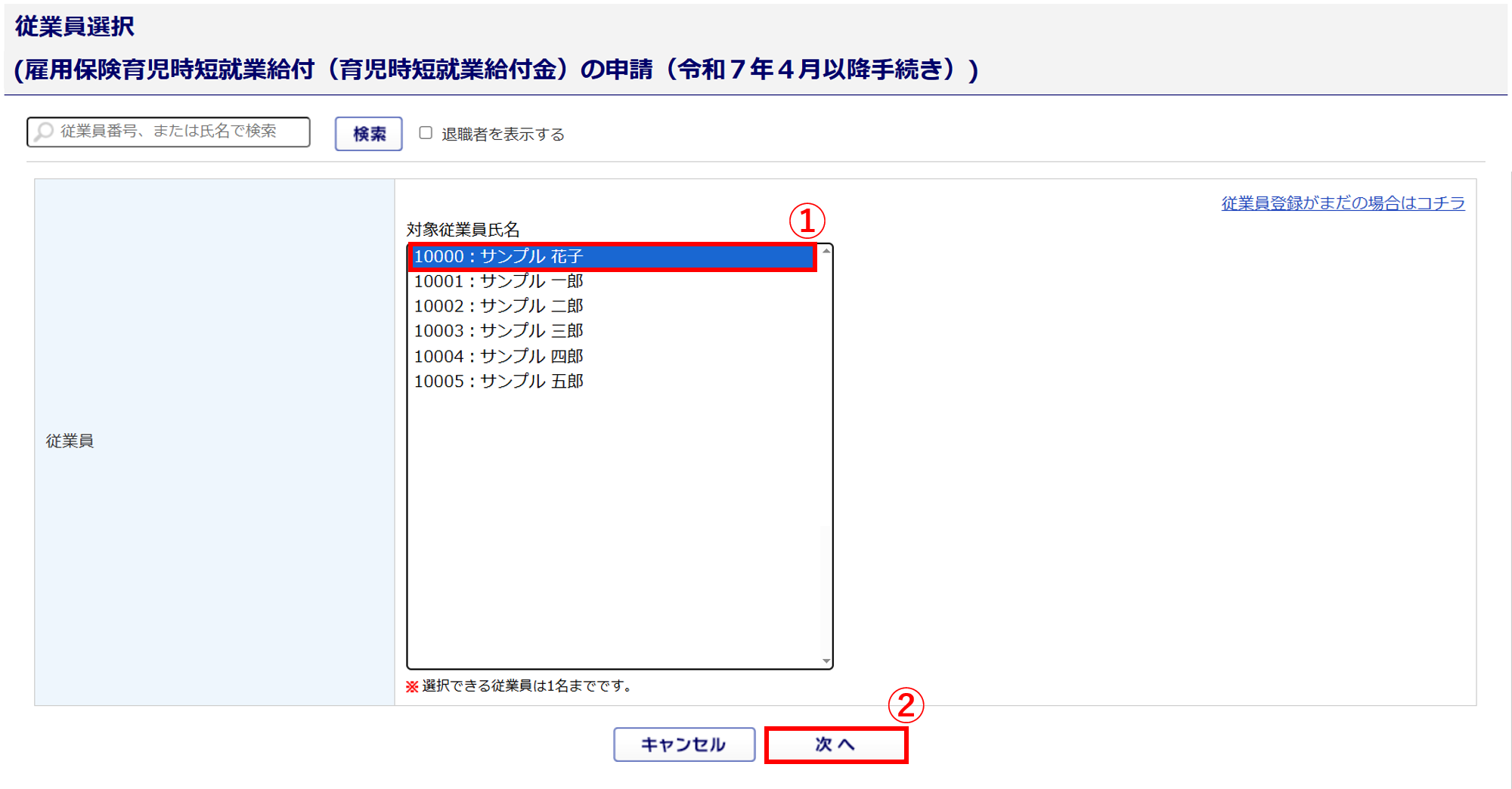 「対象従業員氏名」()を選択し、[次へ]()をクリックします。